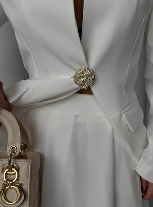 تزيّن الأكمام أزرار ذهبية فاخرة تضيف لمسة أنوثة فخمة.