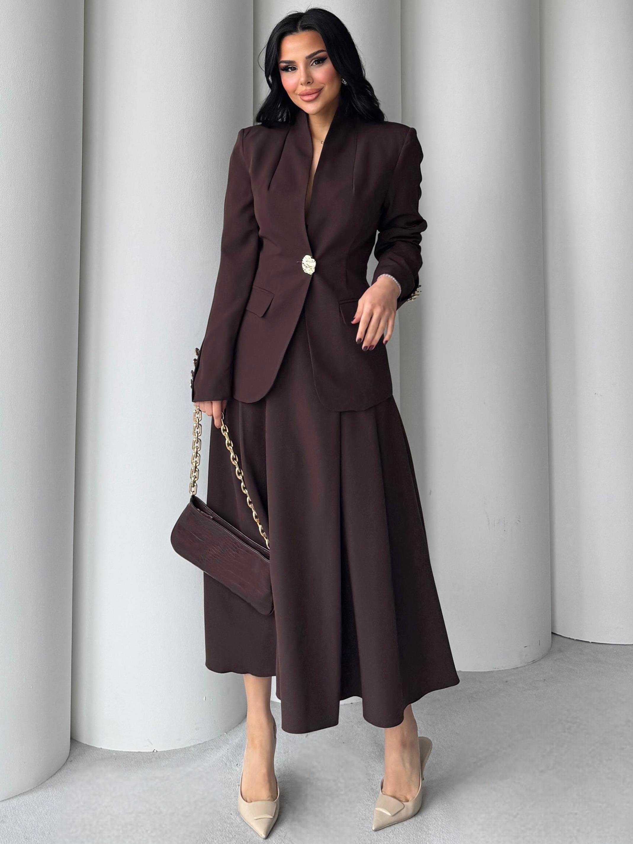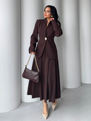 طقم راقٍ مكوّن من جاكيت وتنورة مصنوعين من قماش دبل كريب مستورد عالي الجودة.