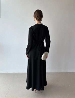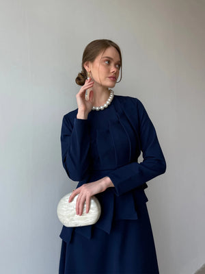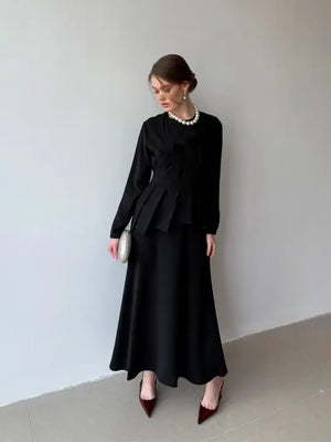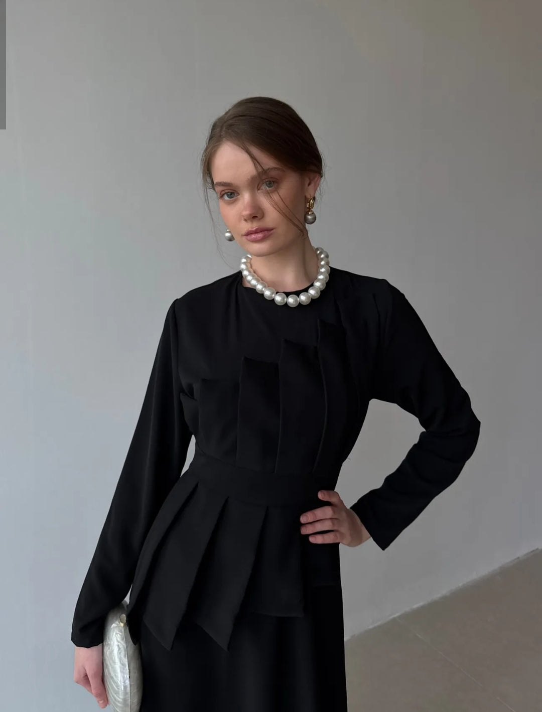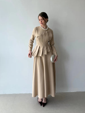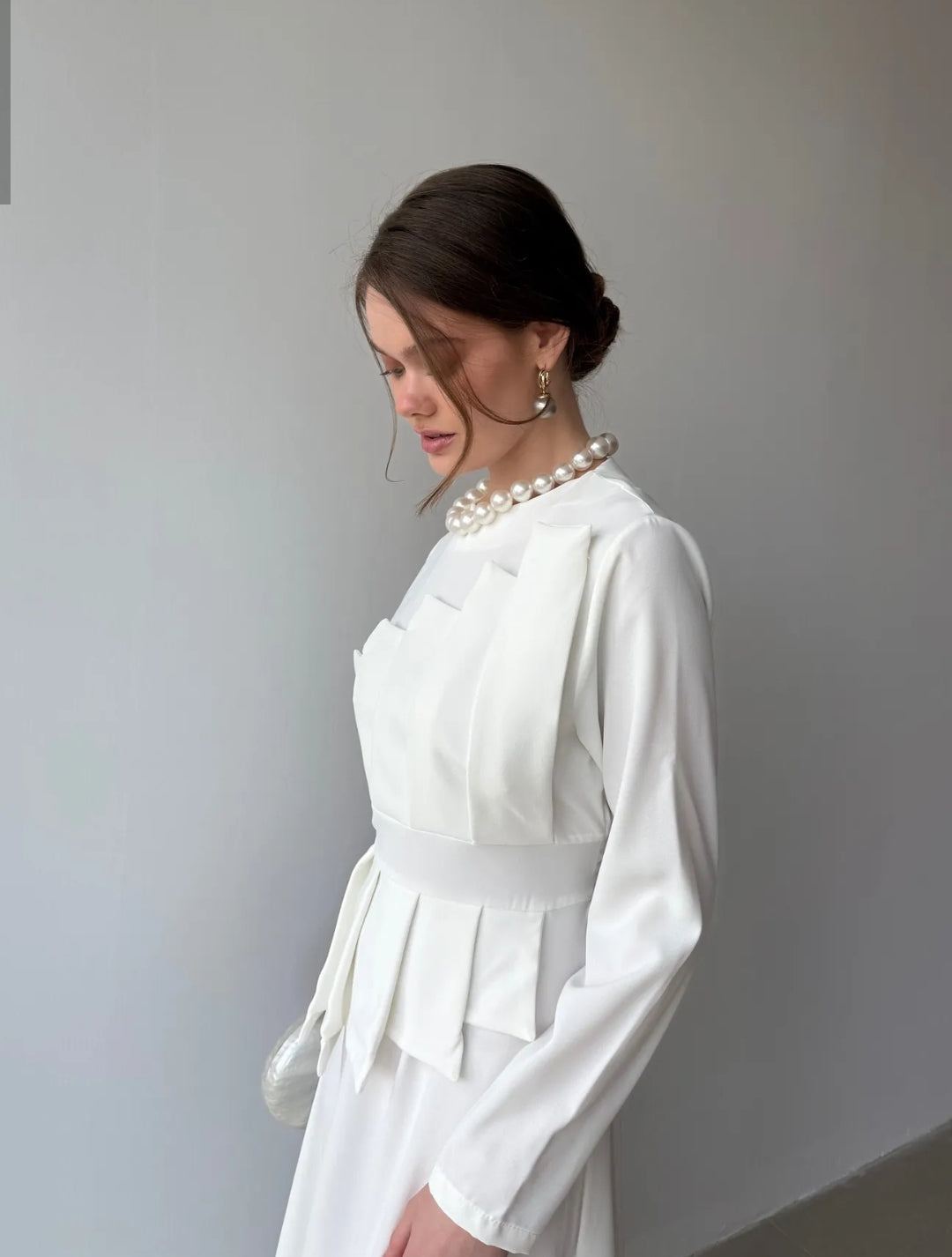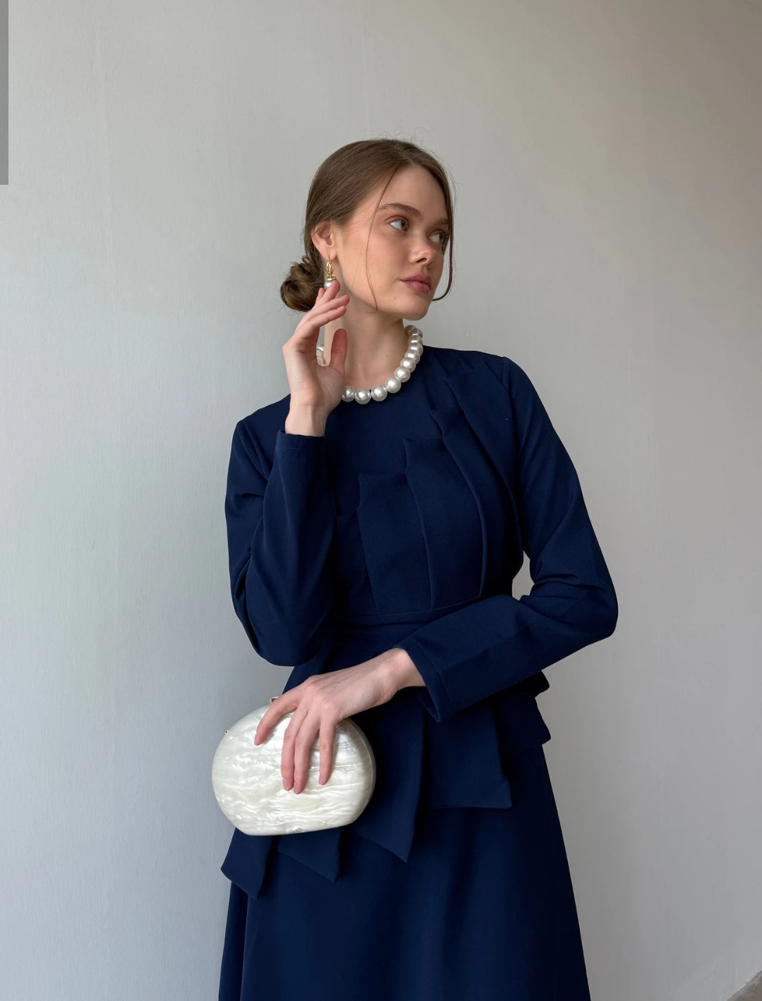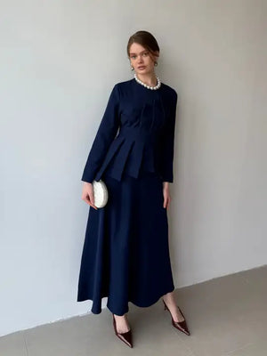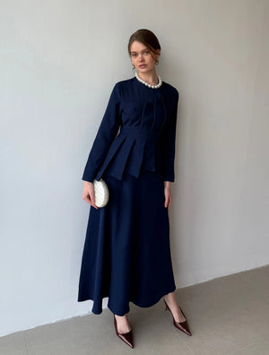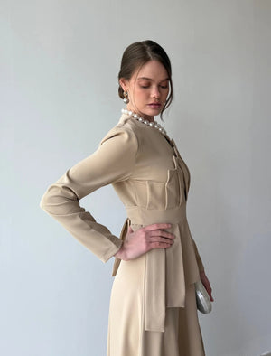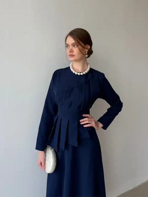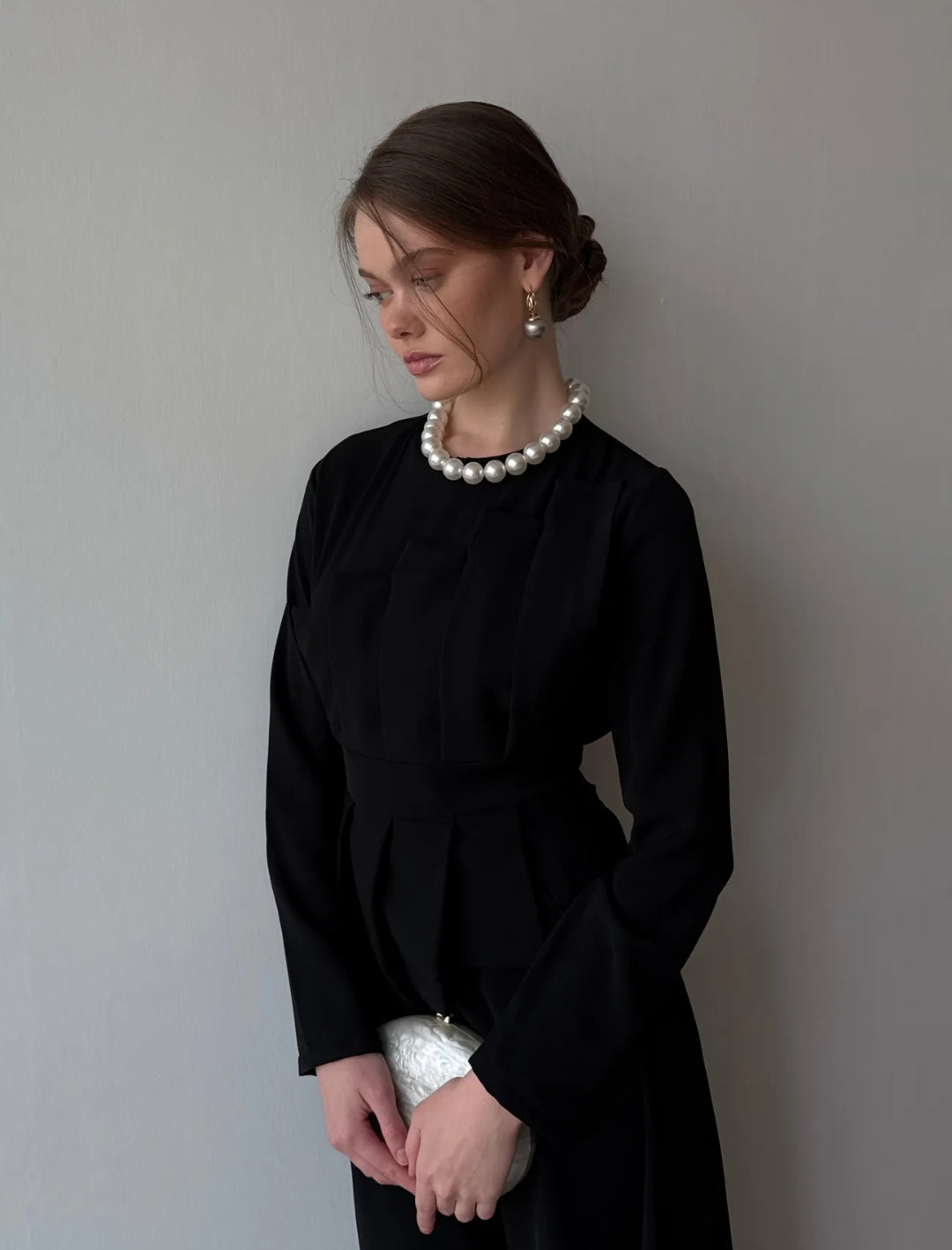 Crafted from premium double crepe fabric, it features a fluid yet structured drape that falls gracefully without clinging to the body. Its wrinkle-resistant quality ensures a polished look throughout the day, offering both elegance and comfort.