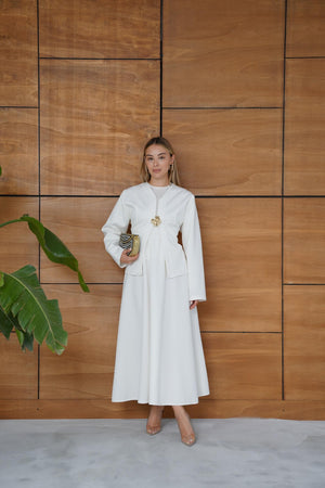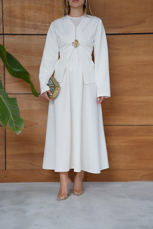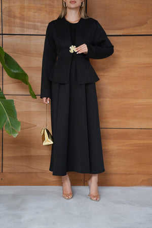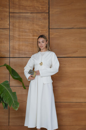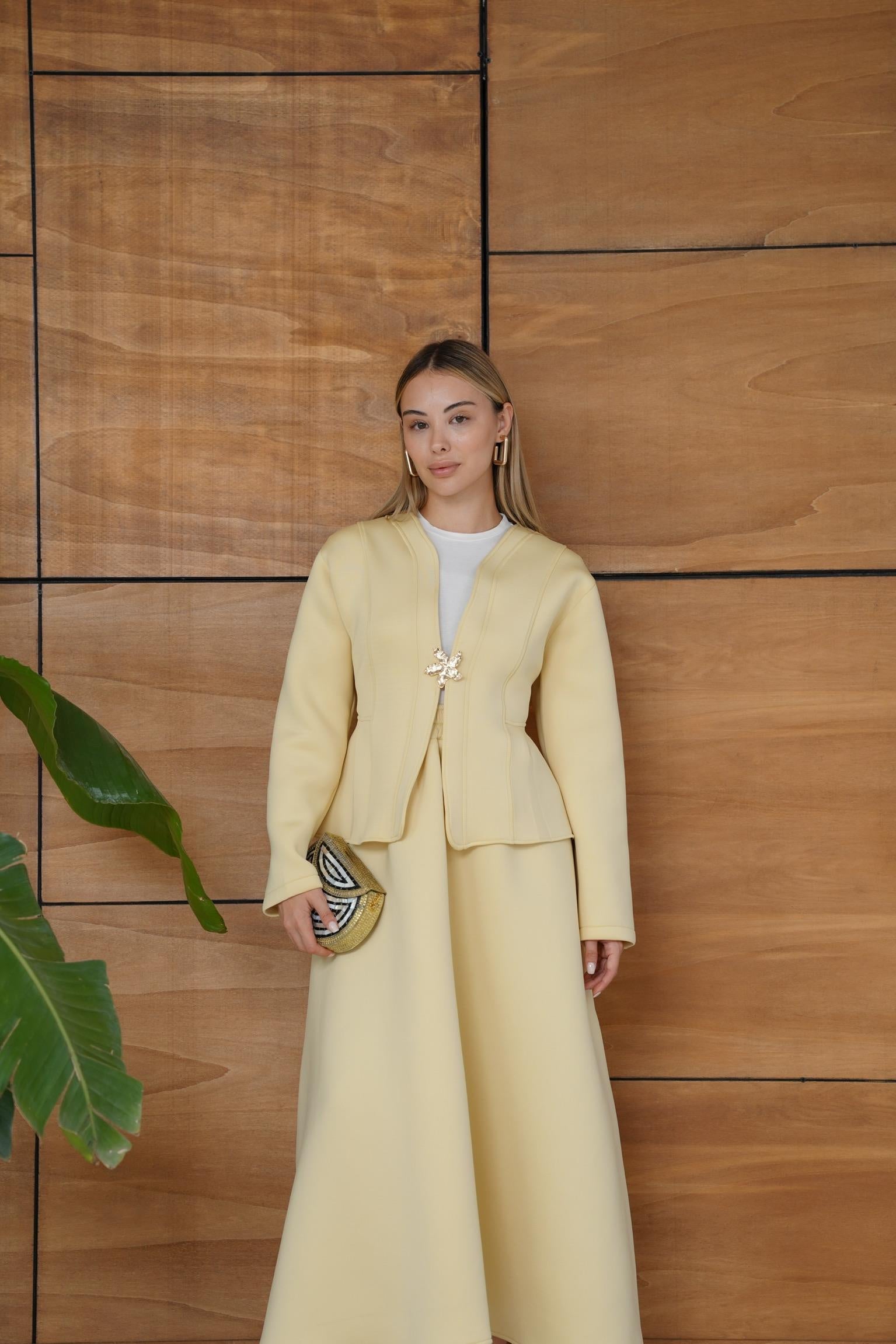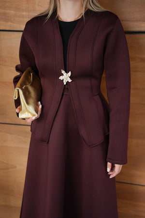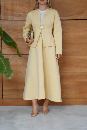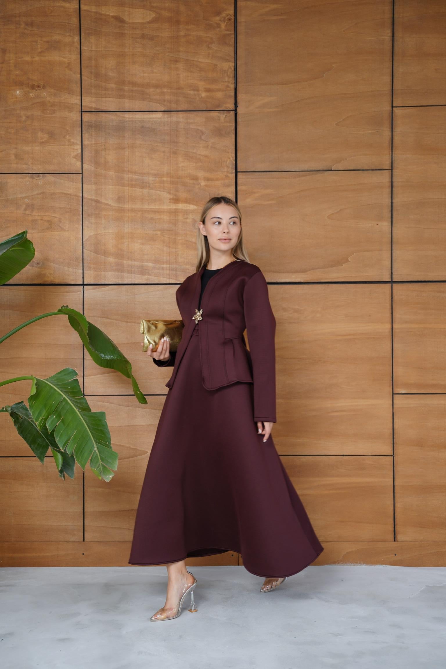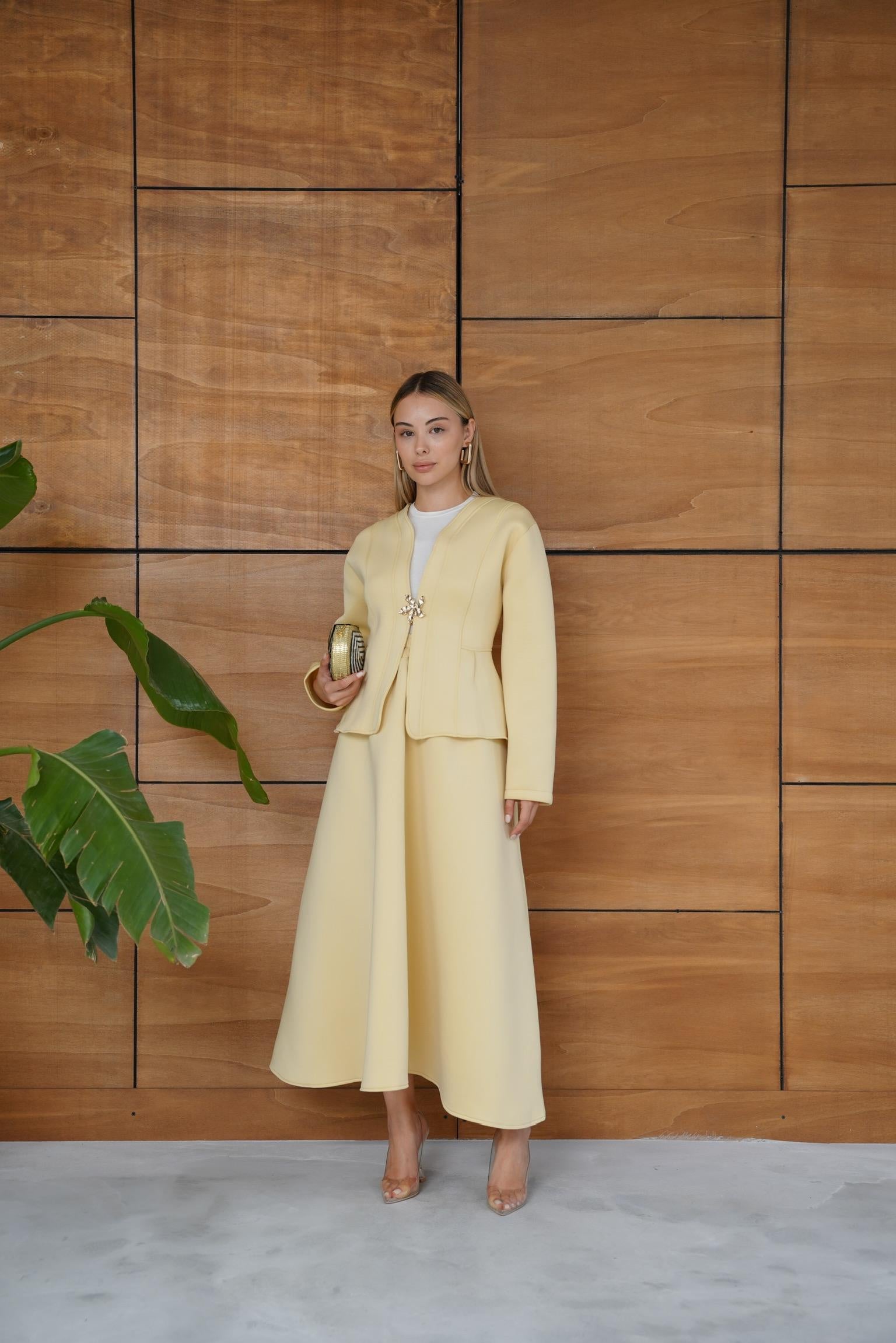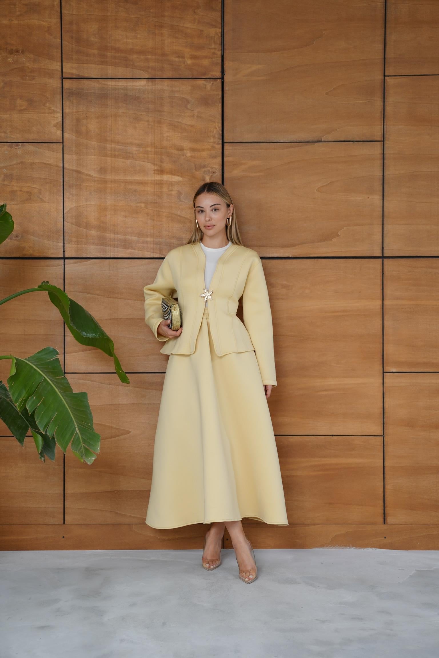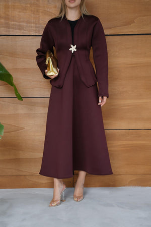 This elegant scuba fabric set features a fitted-waist design with a short jacket and a flowy skirt for a refined, feminine silhouette. Its soft and flexible texture ensures comfort while maintaining a chic, structured look — perfect for both casual elegance and special occasions.