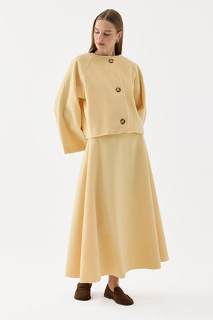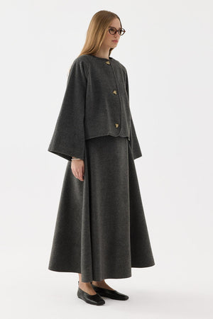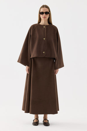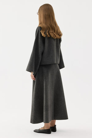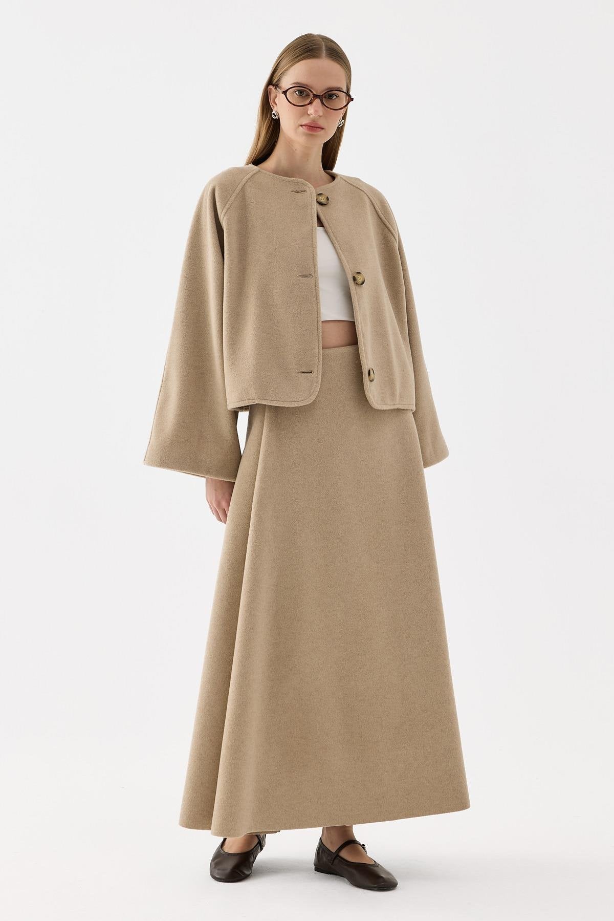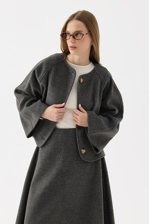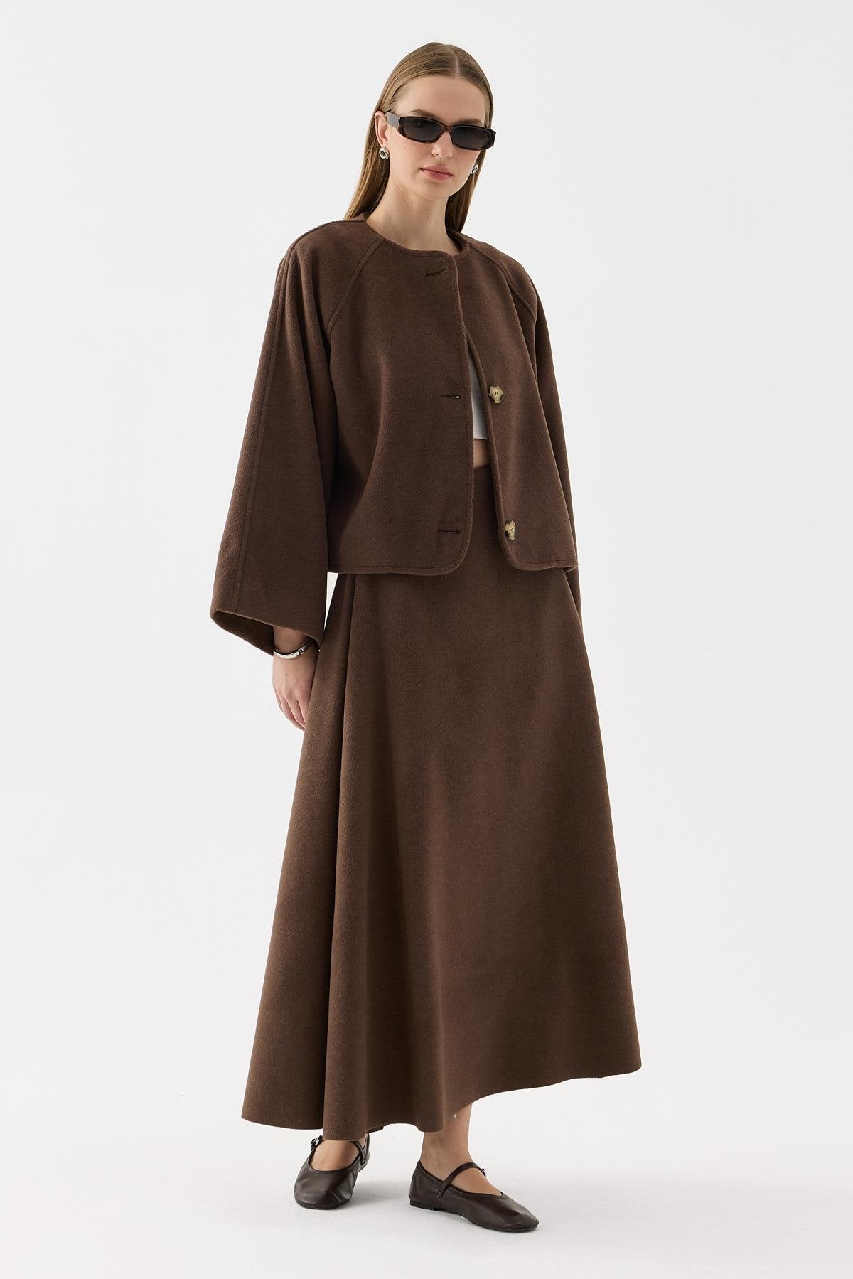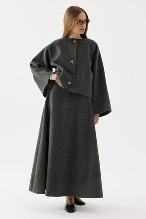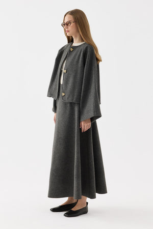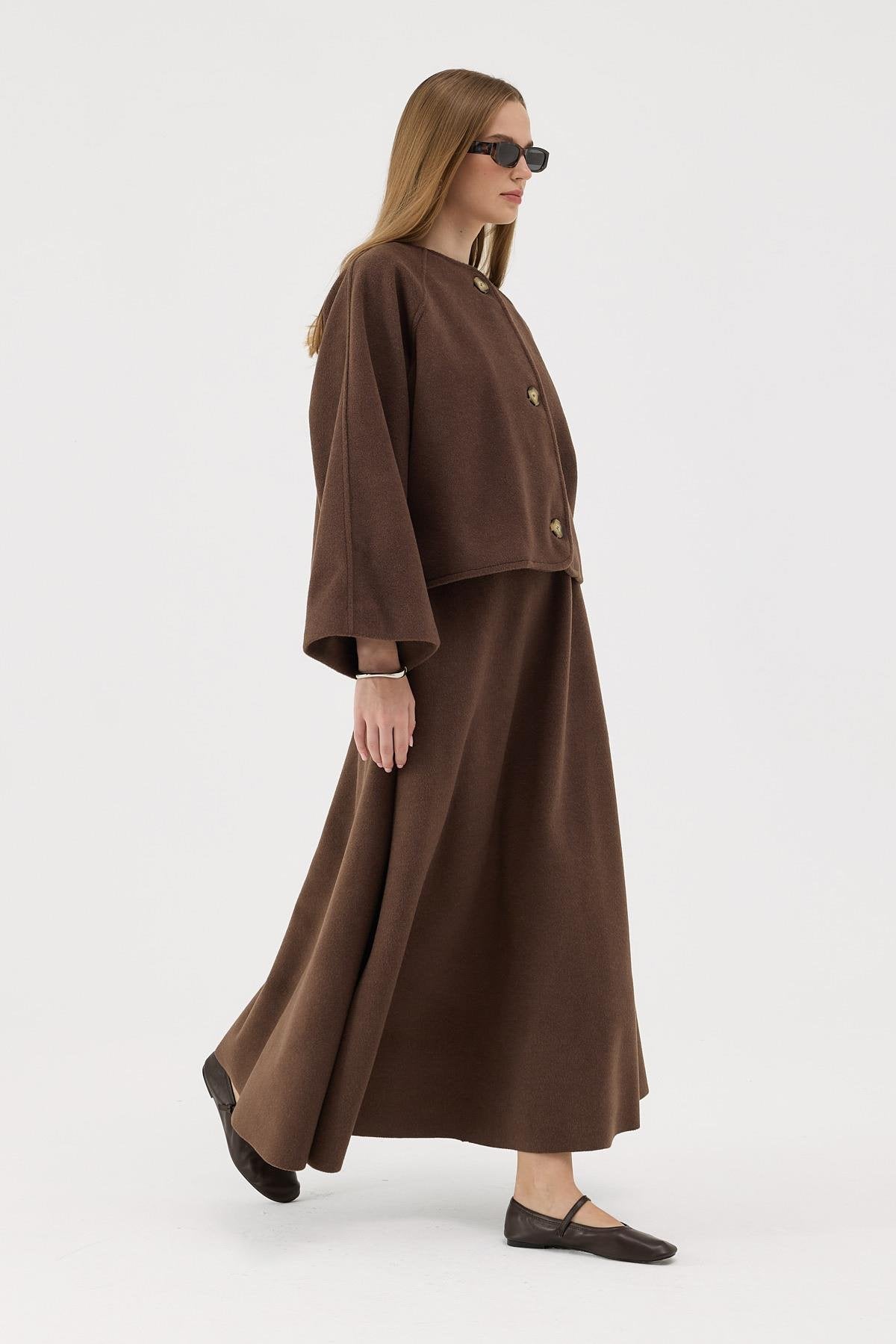 Featuring an open-front buttoned jacket with a round neckline and wide sleeves, paired with a high-waisted flowing skirt, this set delivers a graceful and polished look.