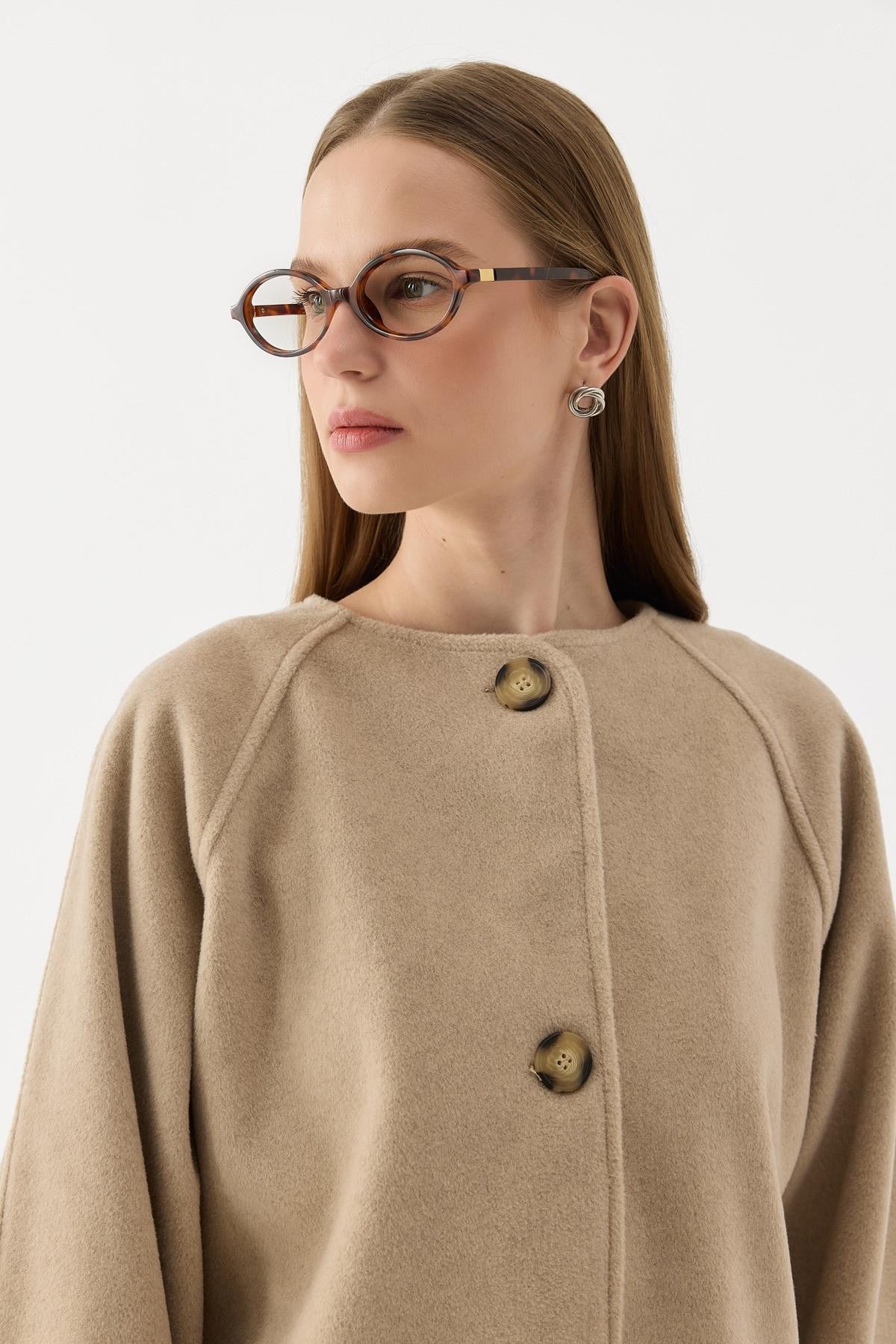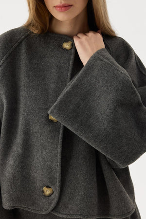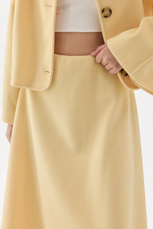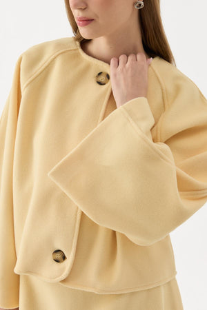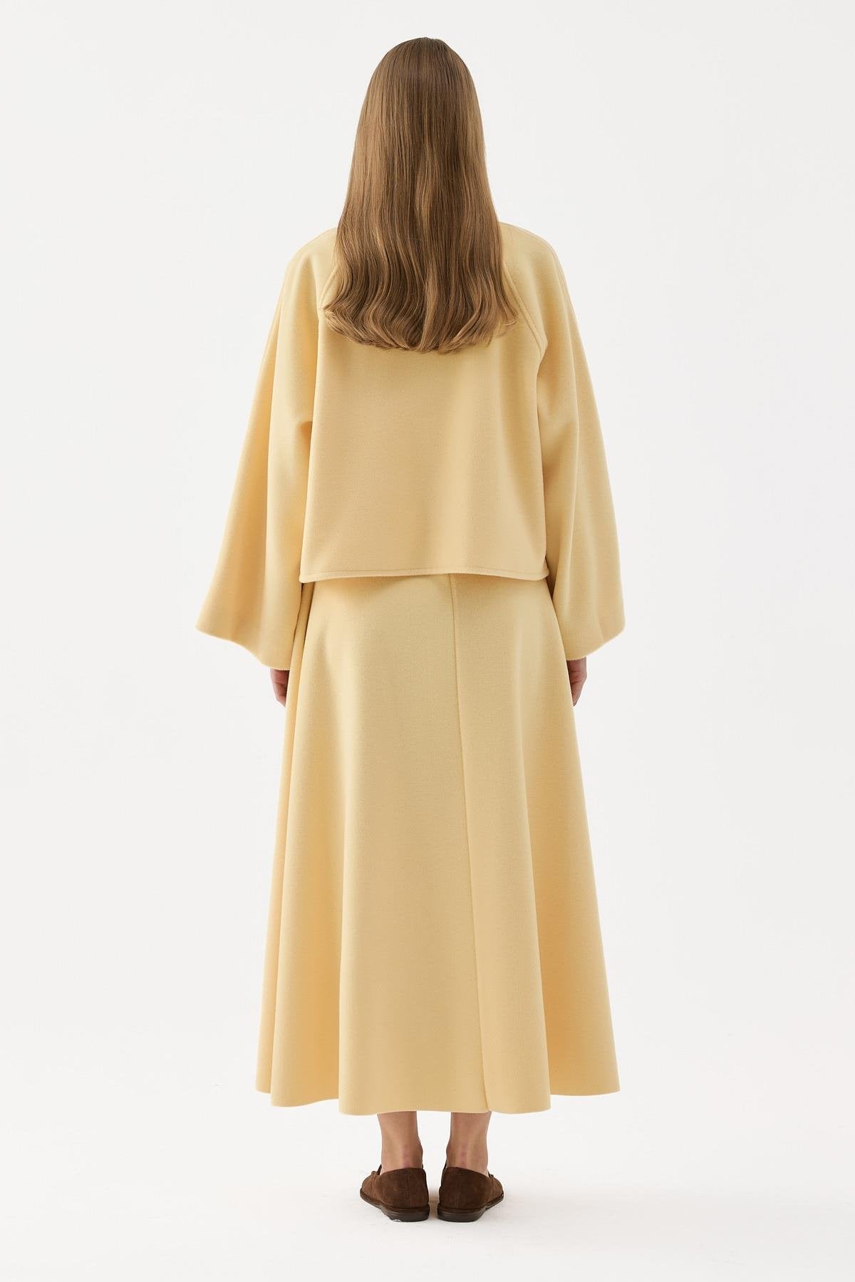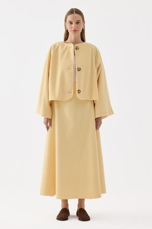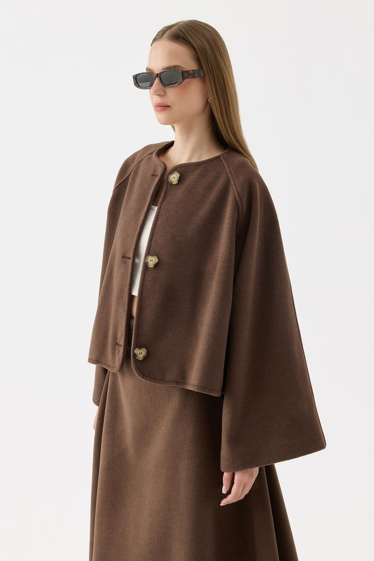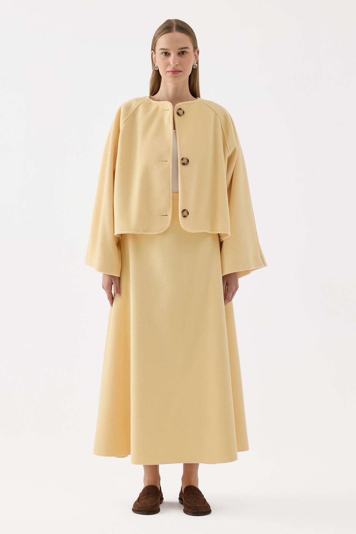 Featuring an open-front buttoned jacket with a round neckline and wide sleeves, paired with a high-waisted flowing skirt, this set delivers a graceful and polished look.