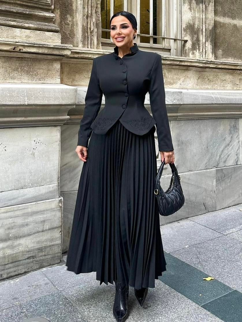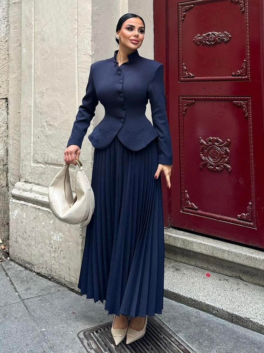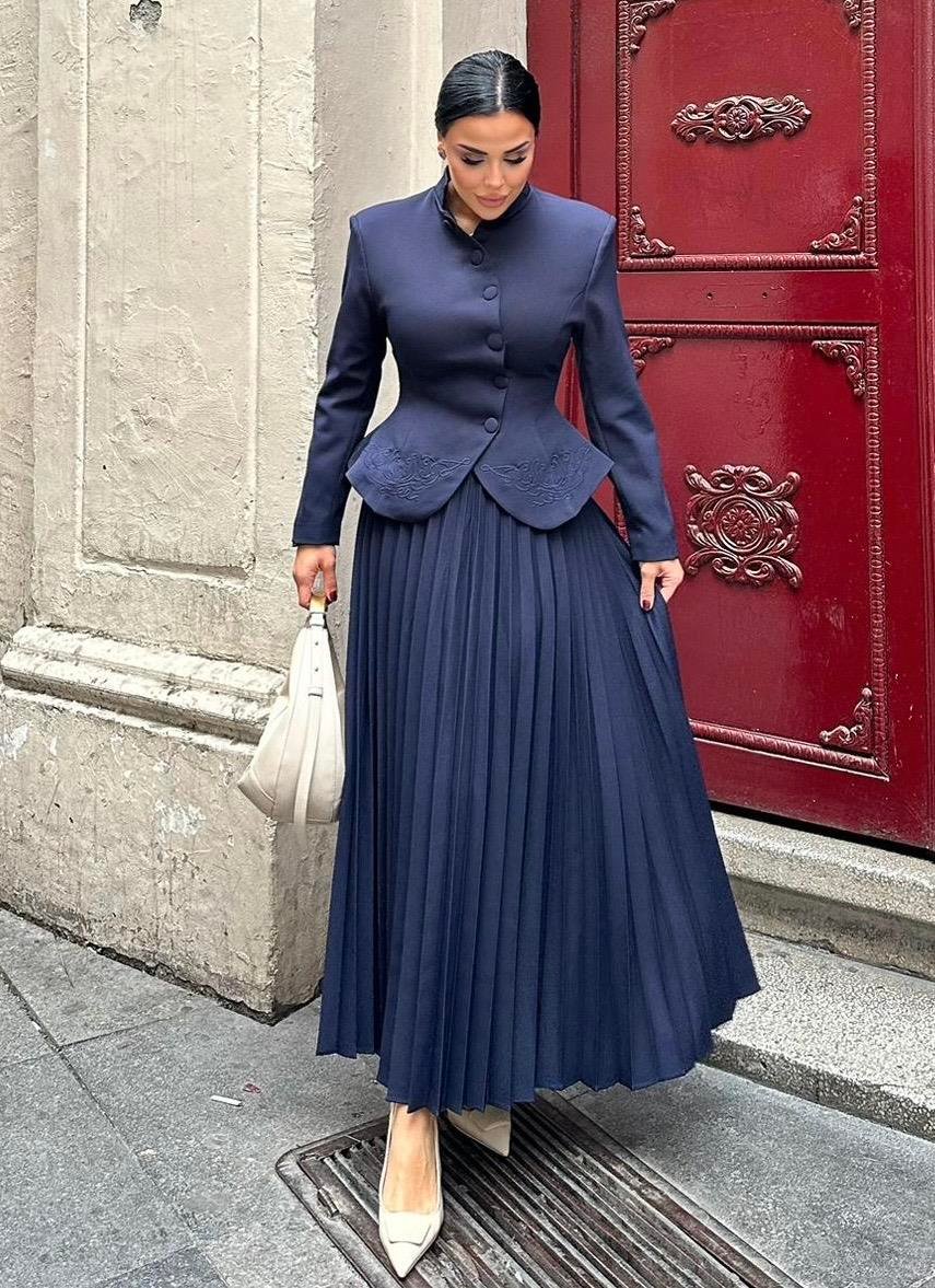 The Embroidered Skirt Suit is designed for women who appreciate refined elegance and detailed craftsmanship. Made from high-quality double crepe fabric, it offers a smooth texture, structured fit, and long-lasting wear.