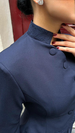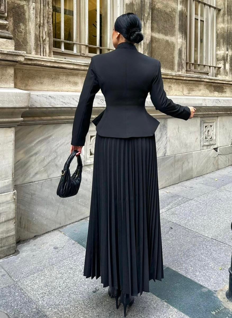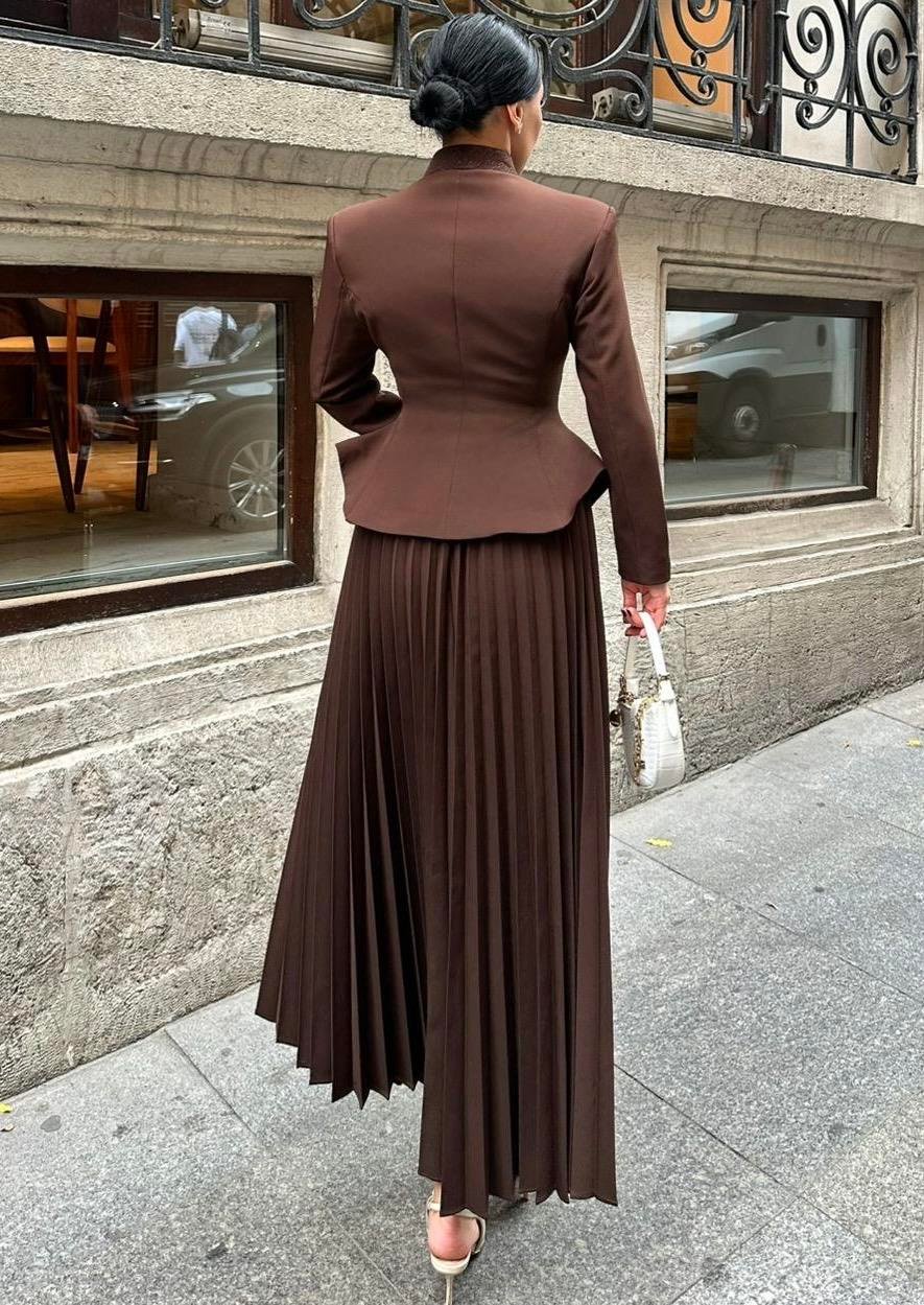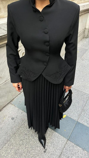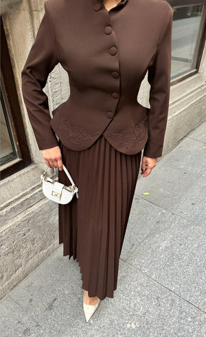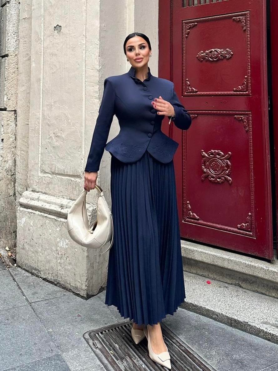 The Embroidered Skirt Suit is designed for women who appreciate refined elegance and detailed craftsmanship. Made from high-quality double crepe fabric, it offers a smooth texture, structured fit, and long-lasting wear.