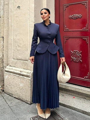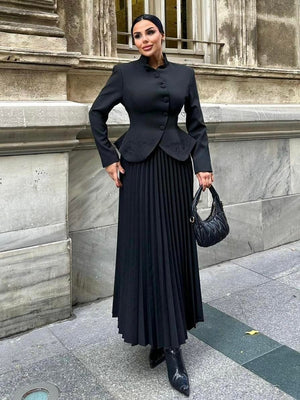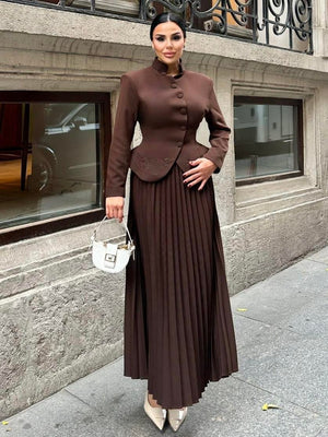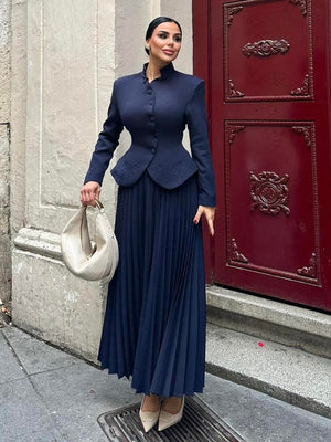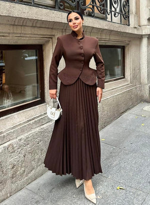 The jacket features delicate embroidery and button details, adding a luxurious touch, while the skirt is designed with an elastic waistband for enhanced comfort and flexibility. Fully lined for a polished and comfortable finish, this suit is perfect for formal occasions, elegant gatherings, and sophisticated everyday looks.
