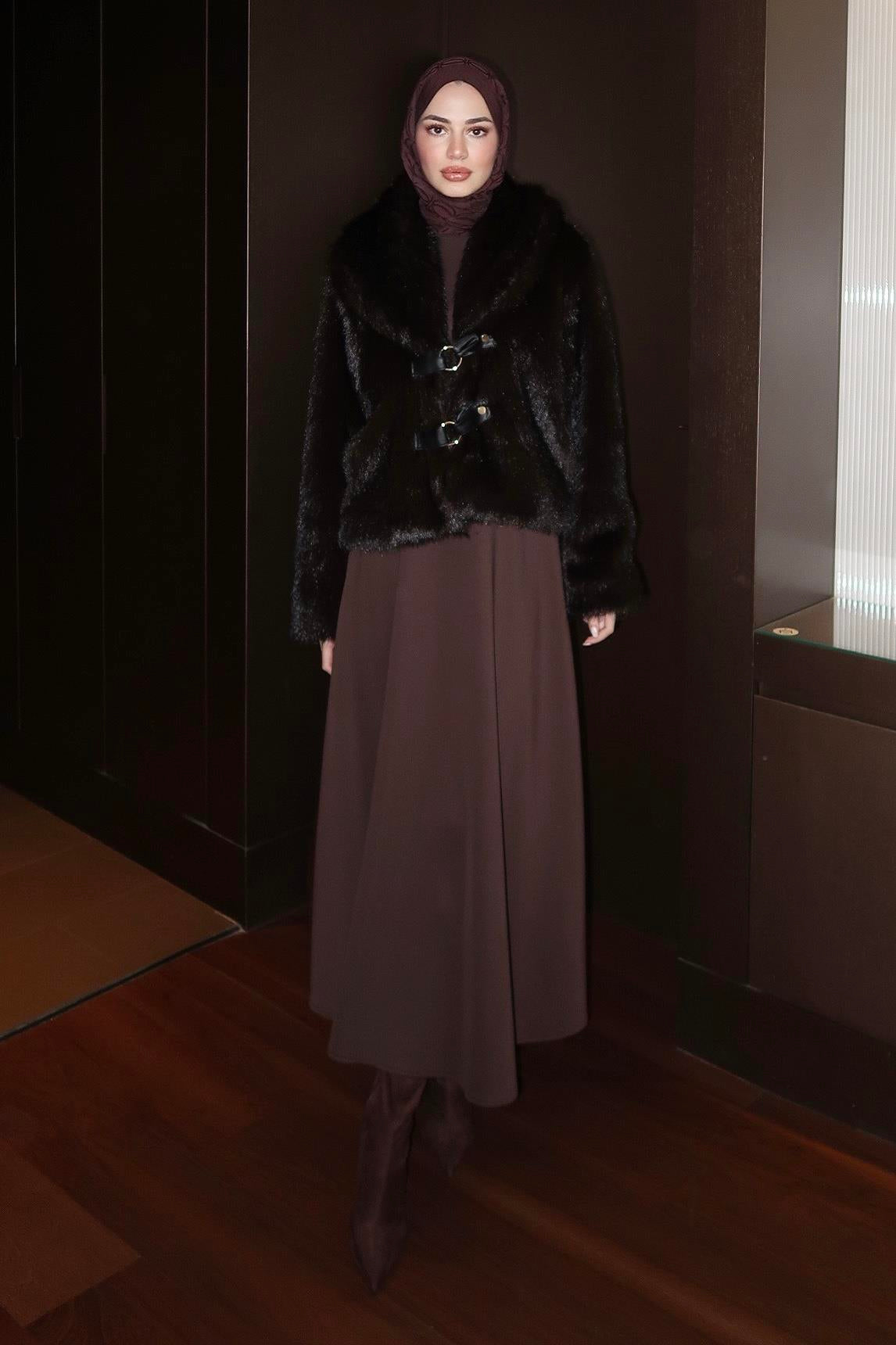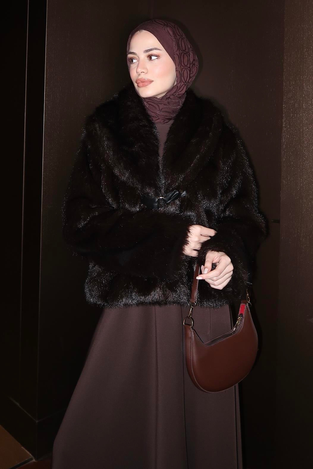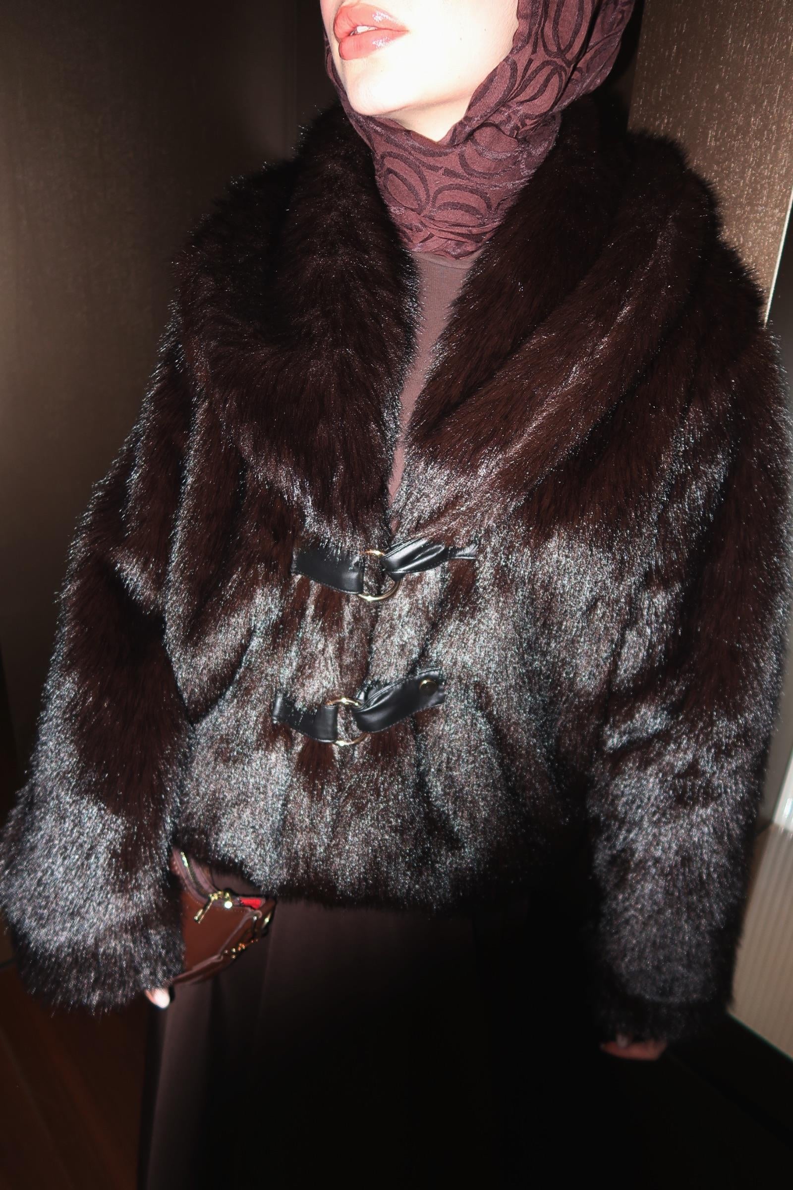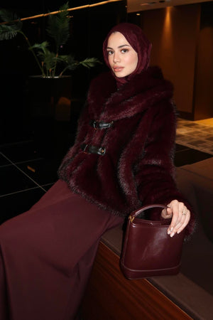 A modern faux fur jacket featuring elegant leather details and a leather belt that enhances the silhouette.