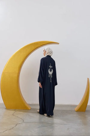 An elegant abaya featuring refined stone embroidery on the back in a graceful crescent-inspired design, adding a subtle touch of luxury without overpowering the look.