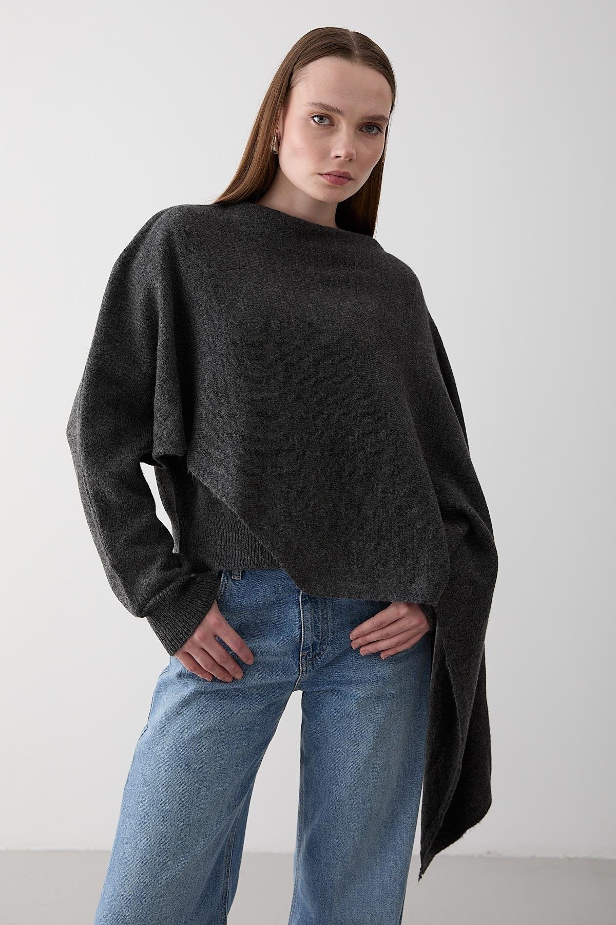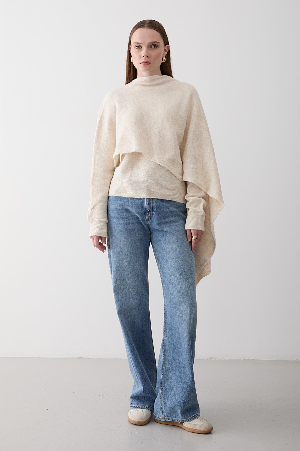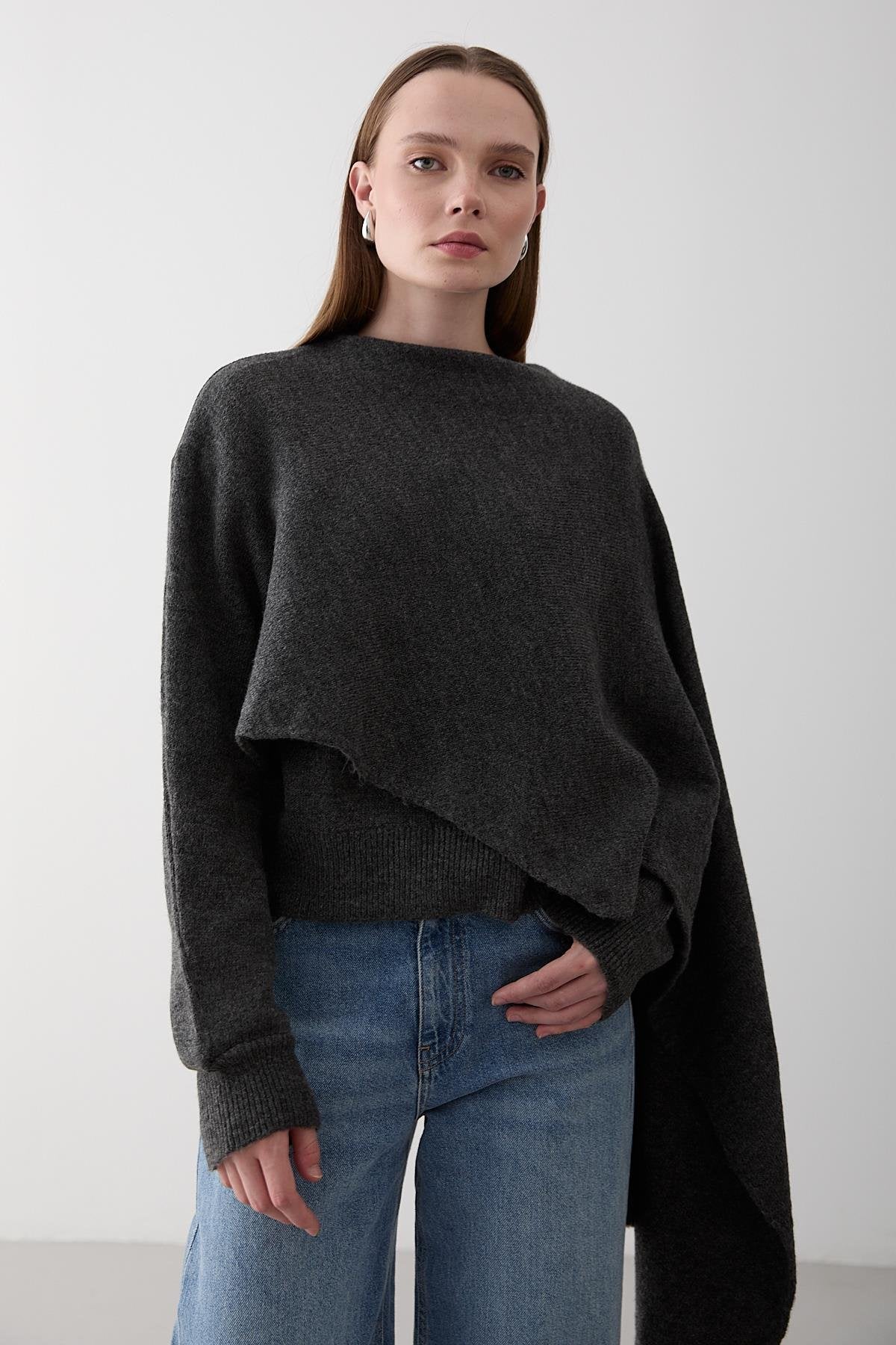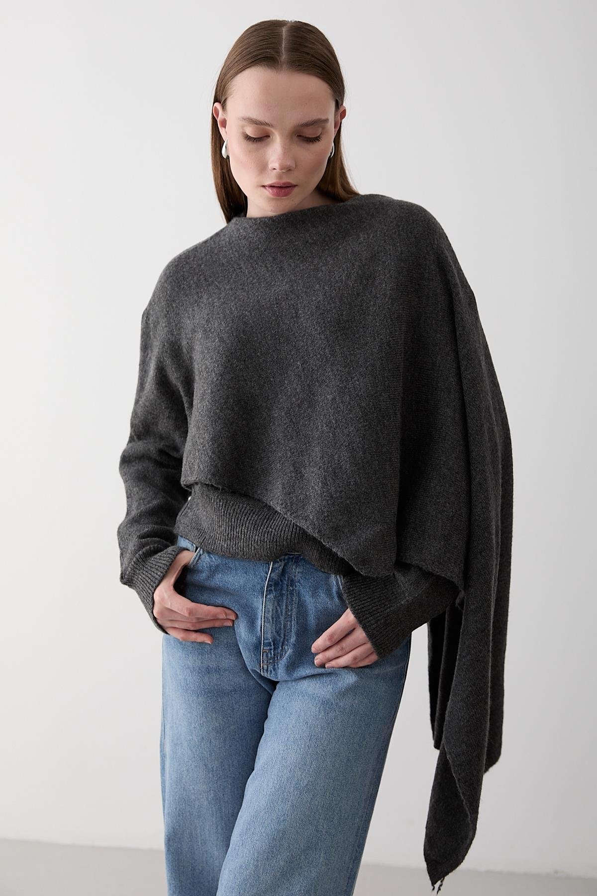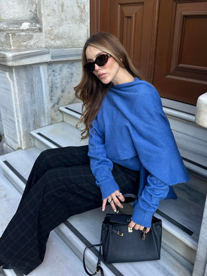 A soft knit sweater with a practical and elegant design, featuring an integrated scarf for added warmth and style. Perfect for everyday and winter outfits, easy to style and comfortable to wear.
