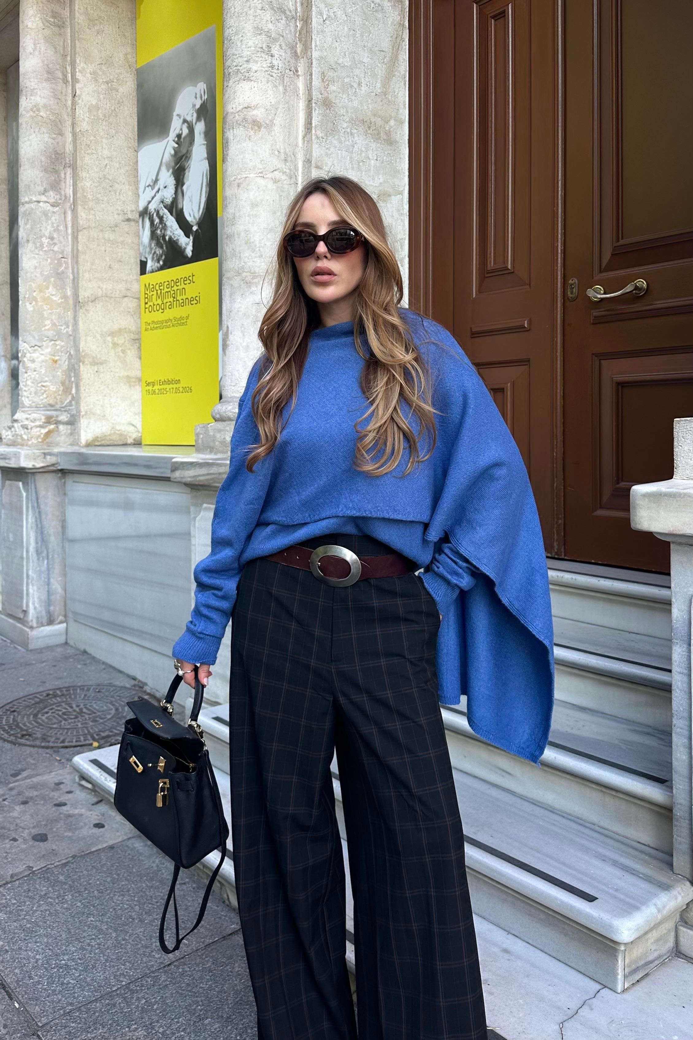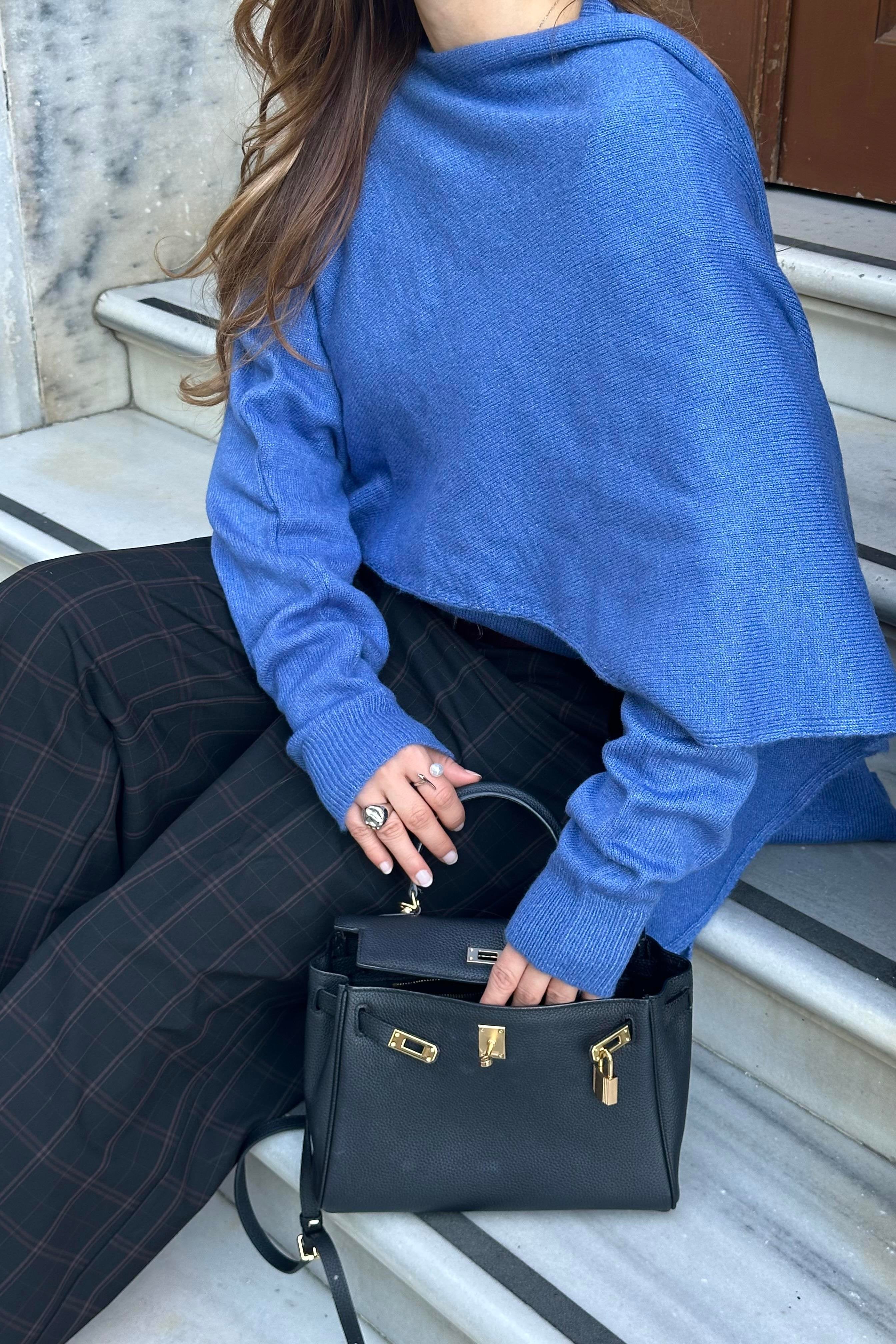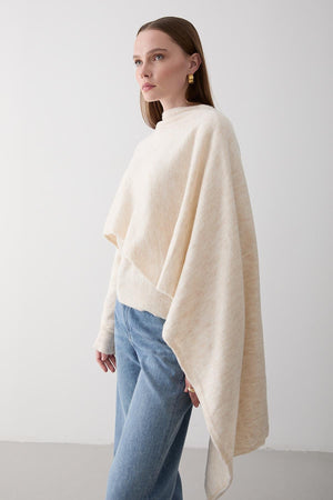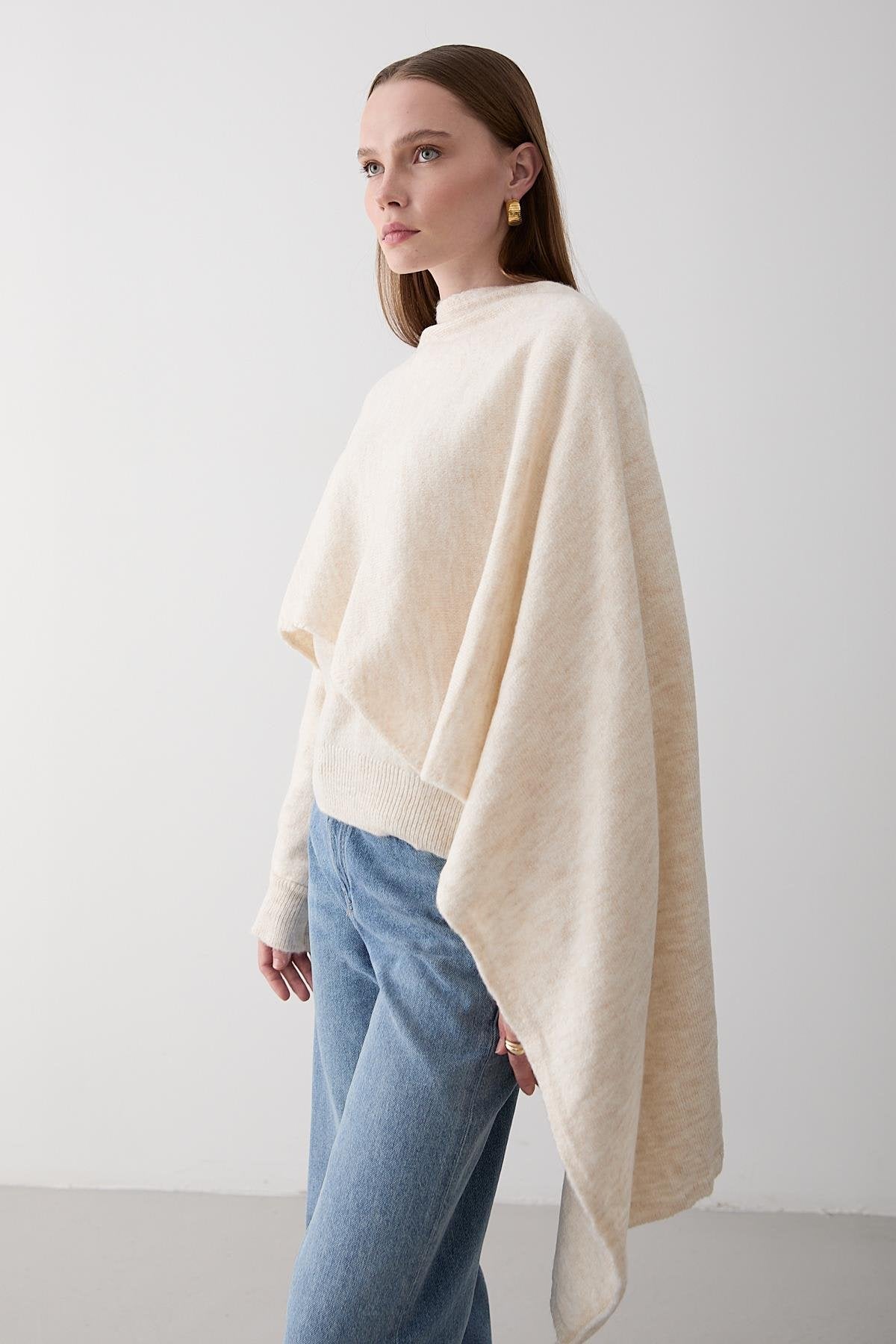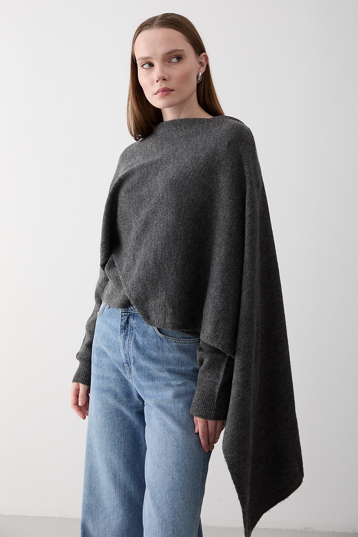 A soft knit sweater with a practical and elegant design, featuring an integrated scarf for added warmth and style. Perfect for everyday and winter outfits, easy to style and comfortable to wear.