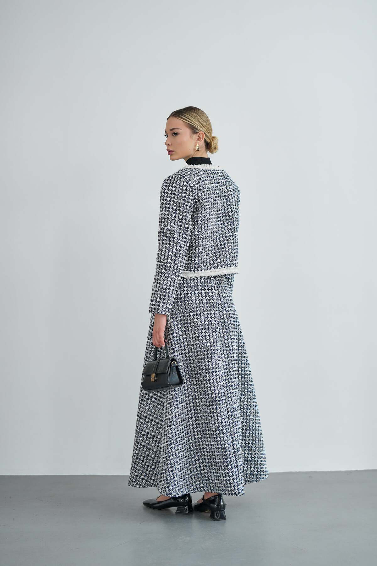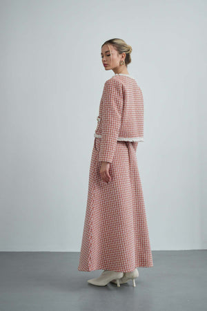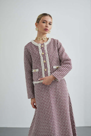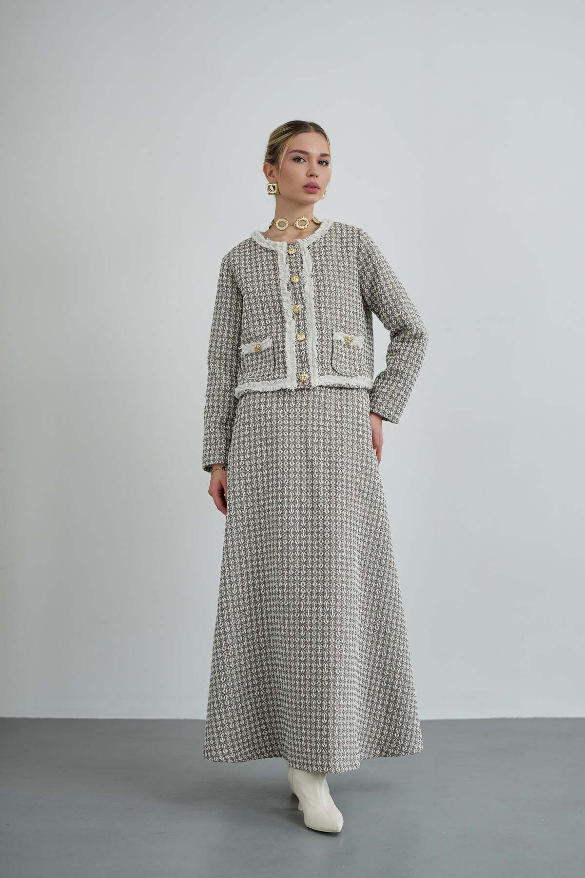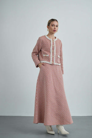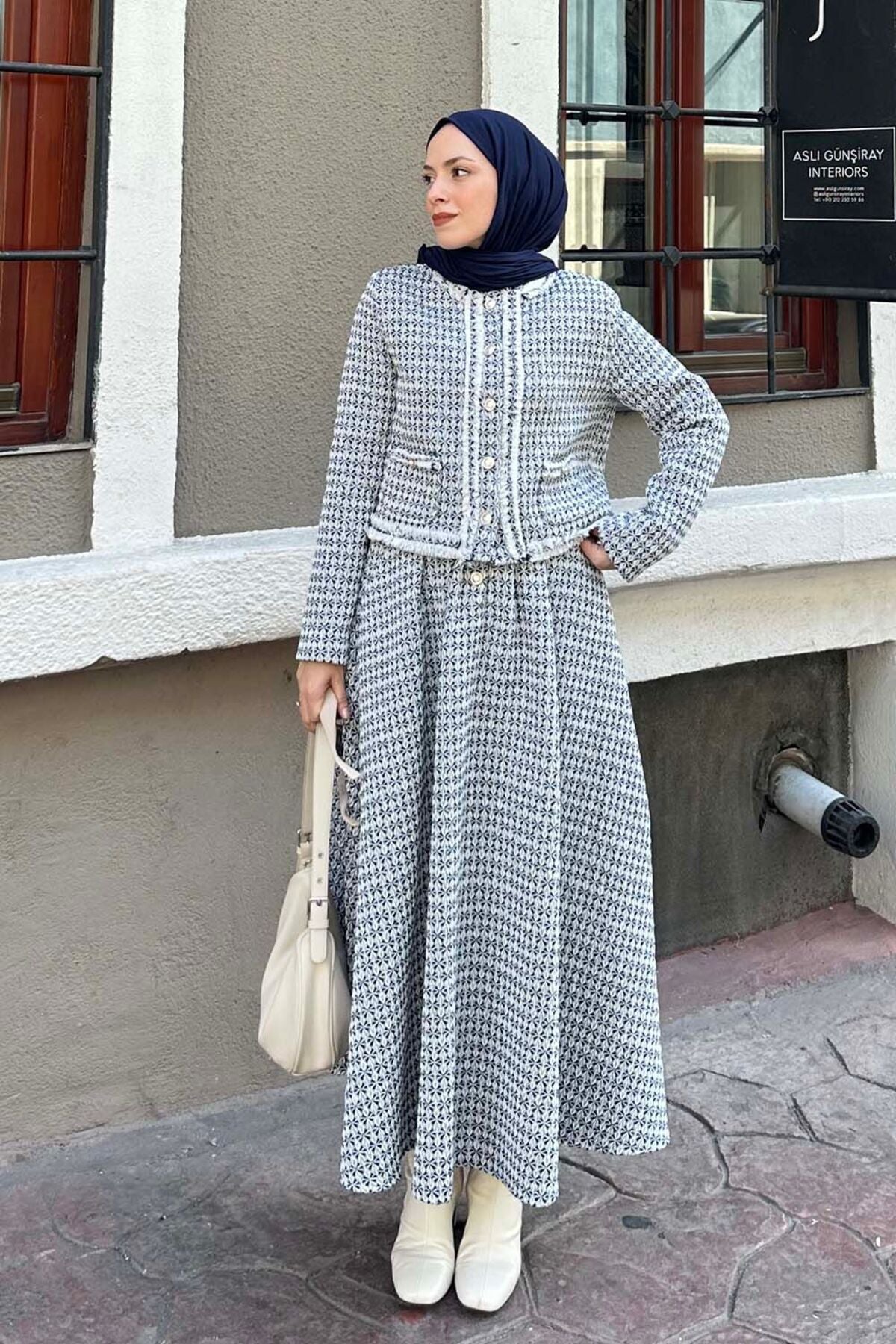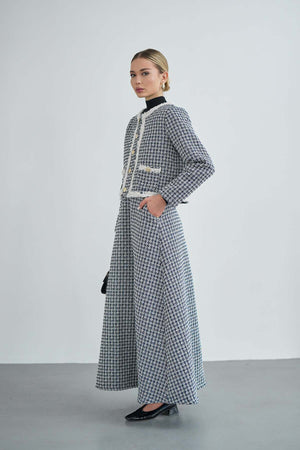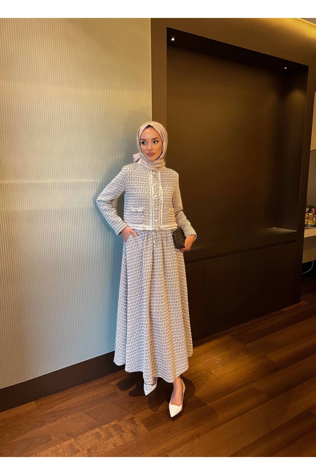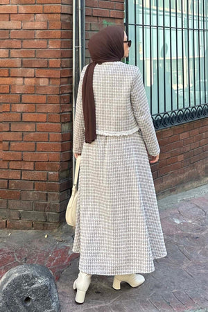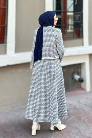 This elegant tweed jacket and skirt suit combines comfort, quality, and timeless style, making it a perfect choice for modest fashion lovers. Crafted from high-quality tweed fabric and fully lined, it offers a comfortable fit and added warmth, ideal for seasonal transitions.