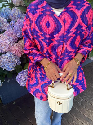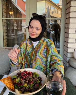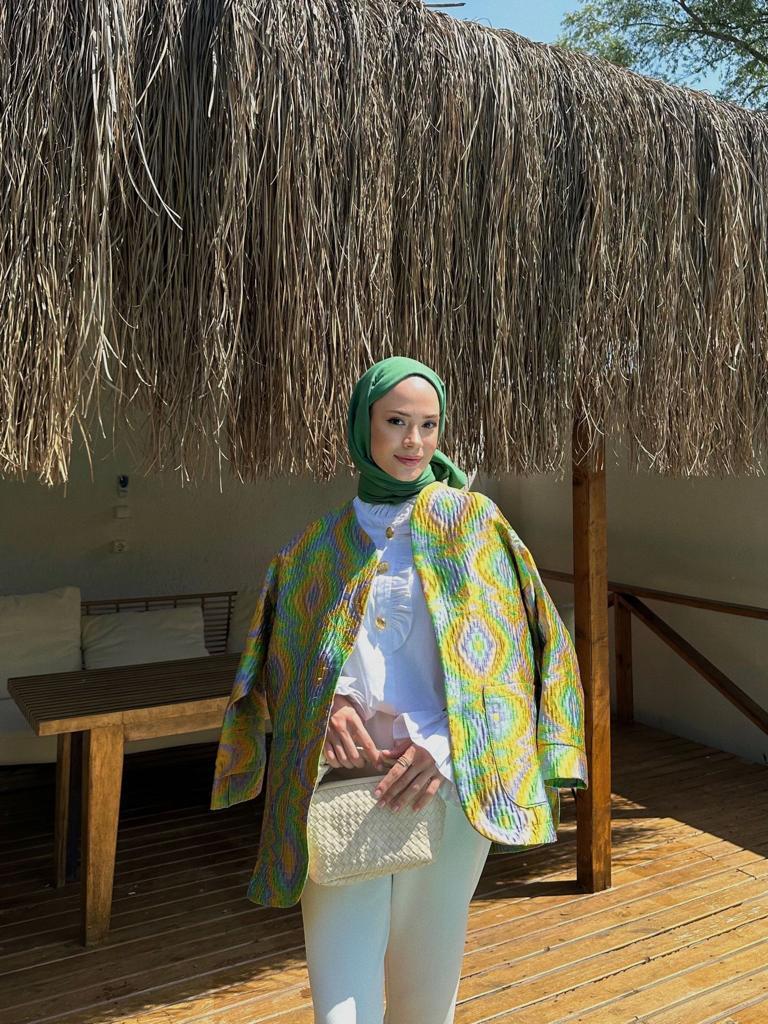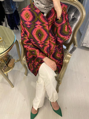 The Colorful Quilted Silk Jacket is designed for women who appreciate distinctive style and refined craftsmanship.