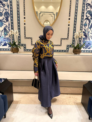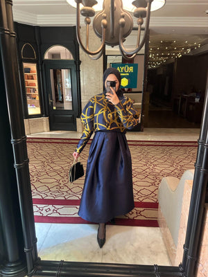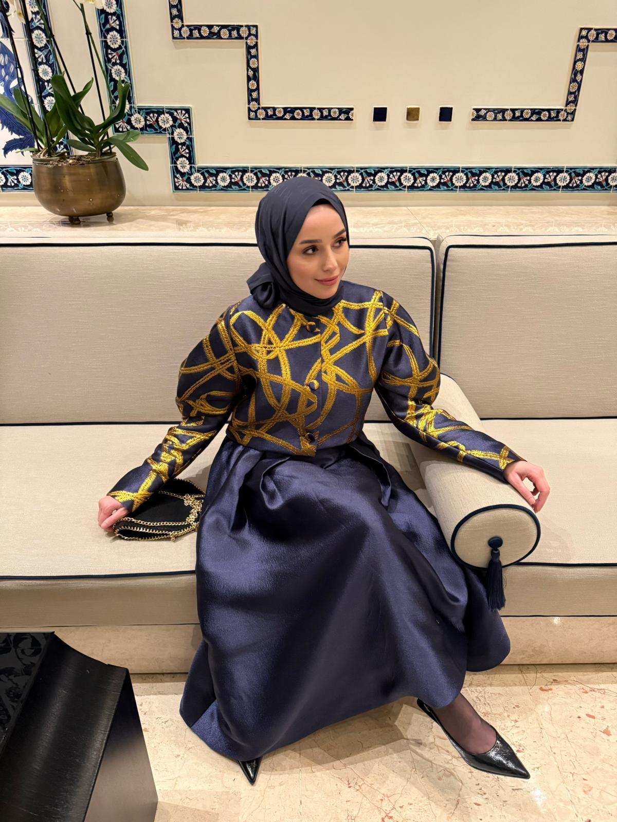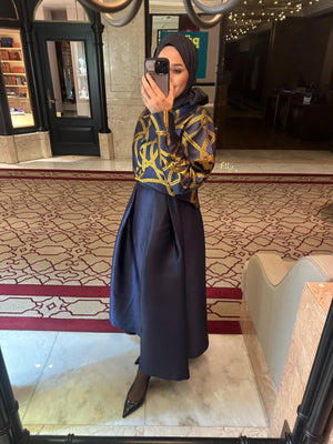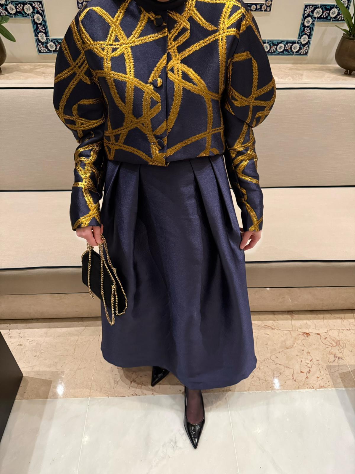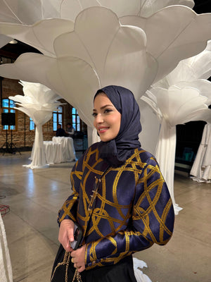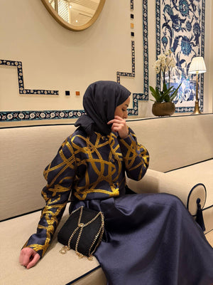 The fabric is custom-woven taffeta, exclusively produced in our factory for our brand, adorned with gold geometric embroidery on a rich dark navy base—an exceptional textile rarely found elsewhere.