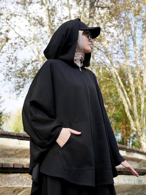 The top comes in a hooded poncho design with a wide and long cut for full coverage.