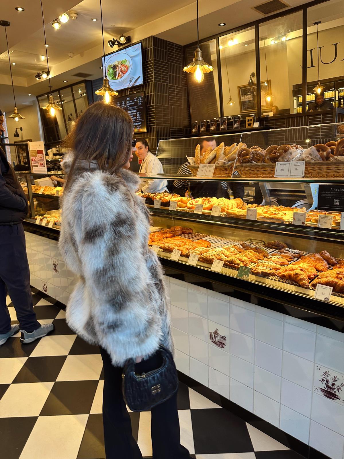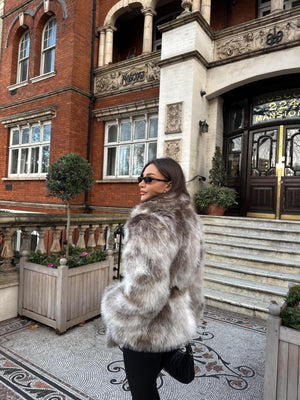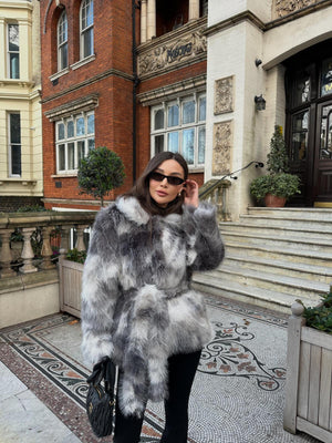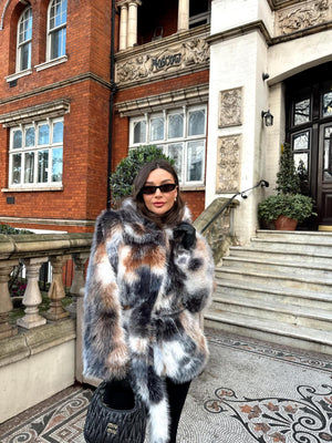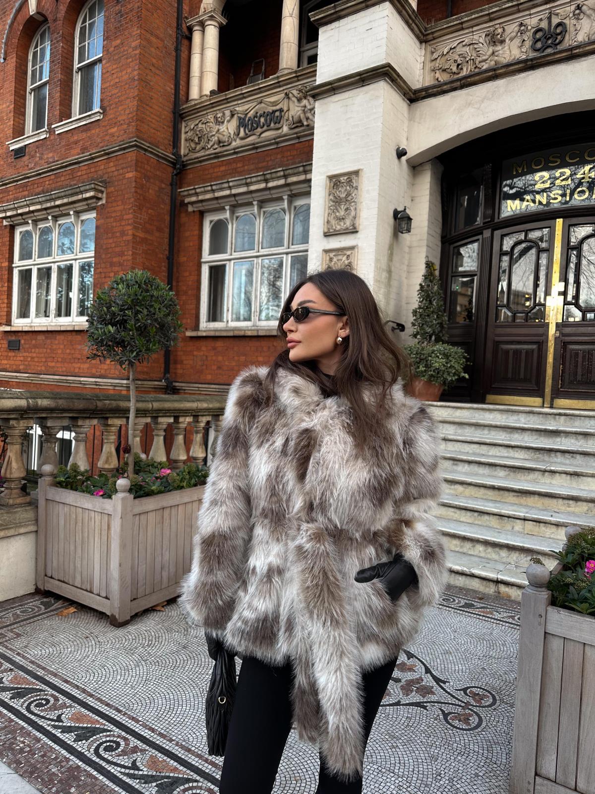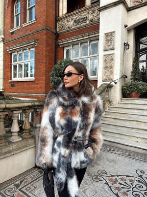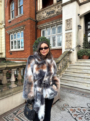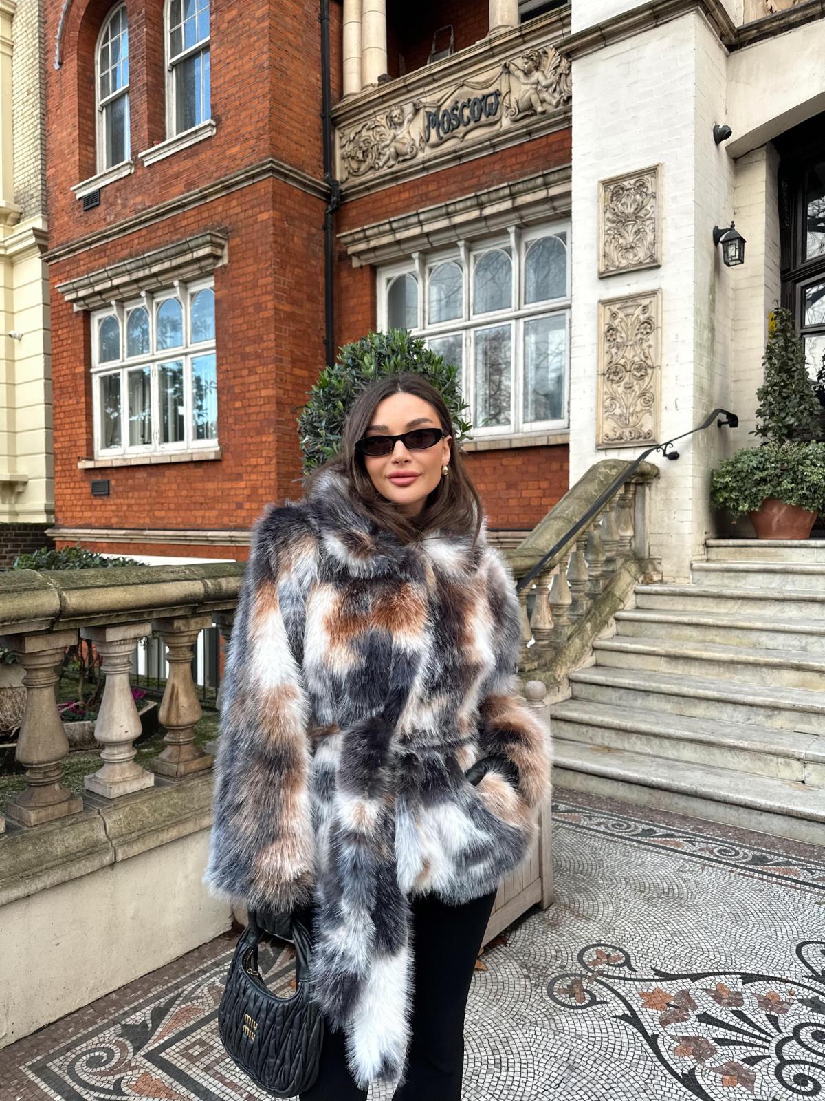A stylish multicolor faux fur coat designed with a matching belt to define the waist and enhance the silhouette.