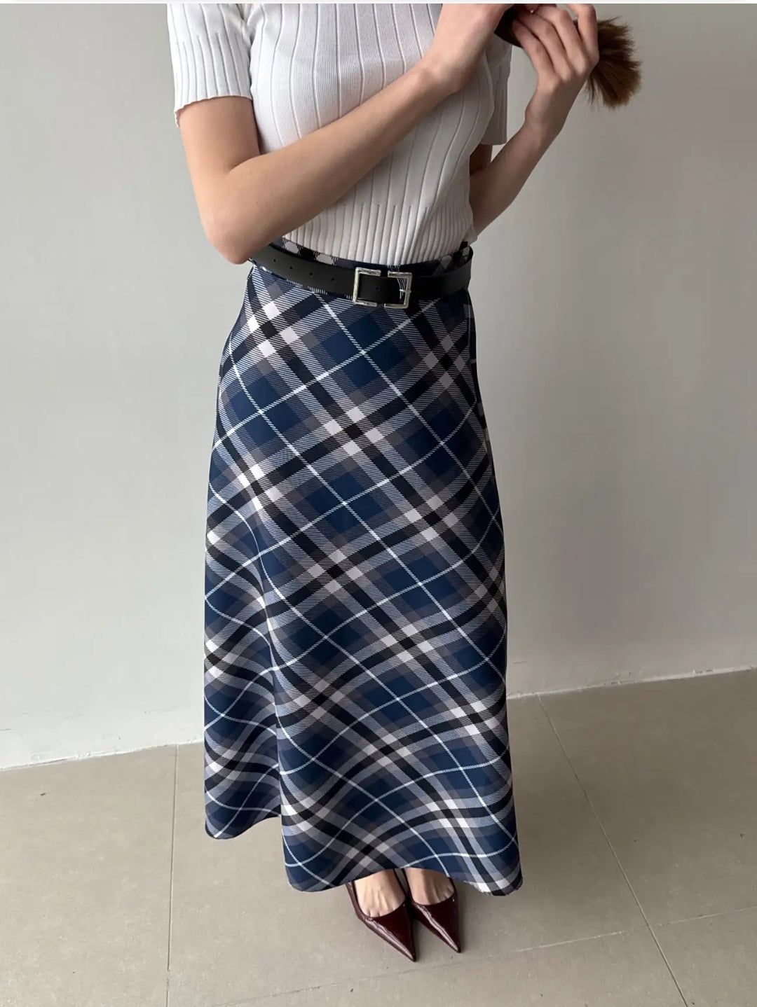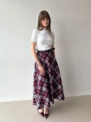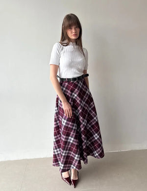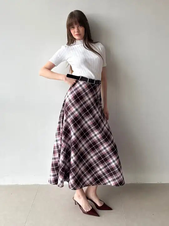 The Ekose Plaid Flared Skirt is a versatile piece designed to balance comfort and sophistication, making it perfect for both daily wear and special occasions.