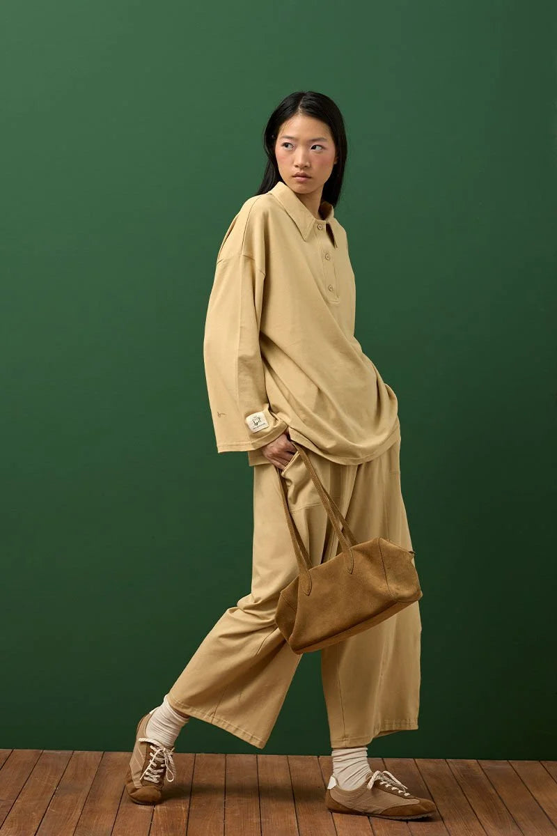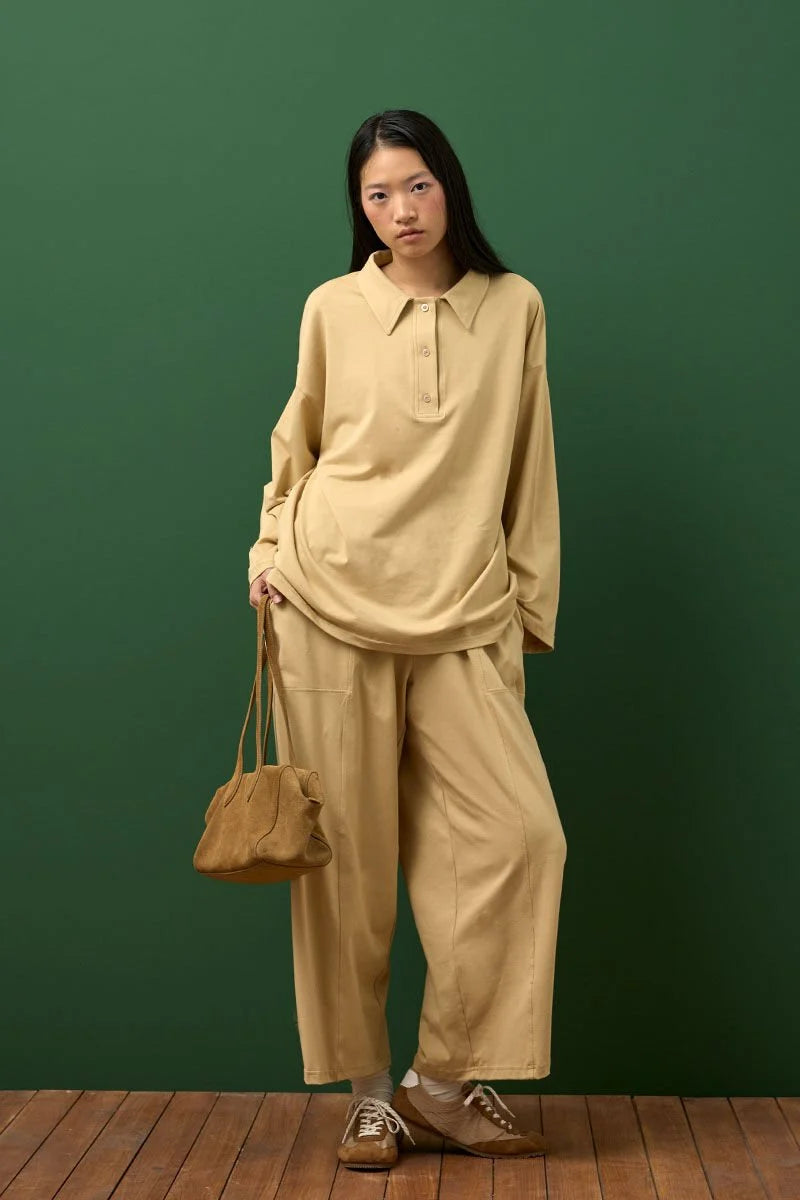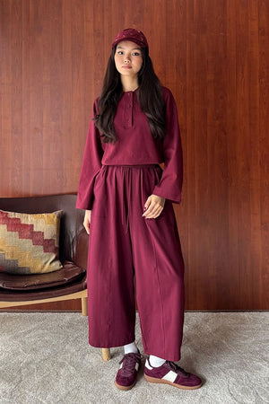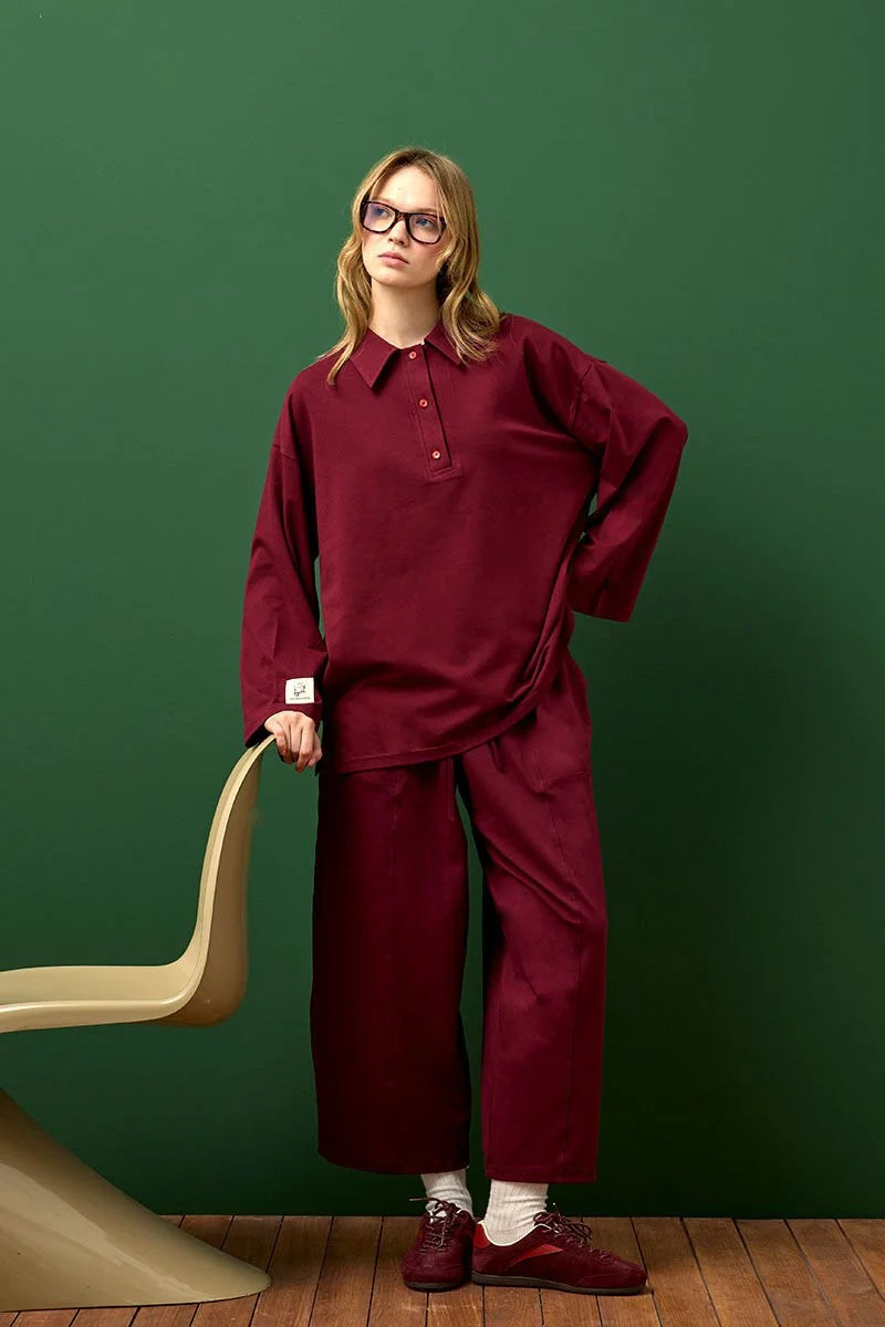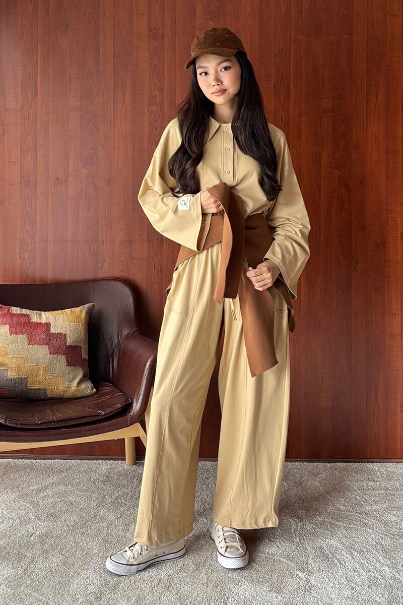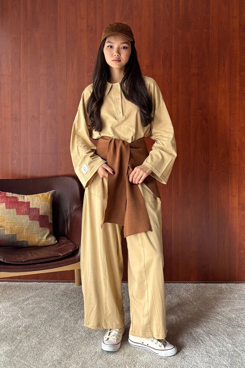 مصنوع من قماش سوبريم الناعم والمريح، ويتكوّن من تونيك بياقة بولو كلاسيكية وبنطال واسع بخصر مطاطي لارتداء سهل ومريح.