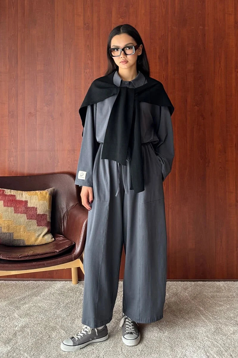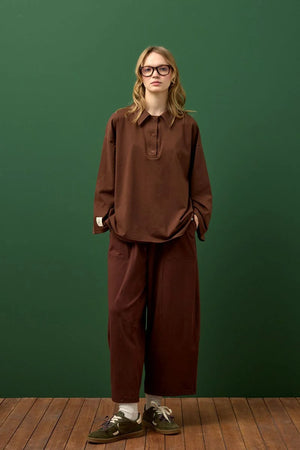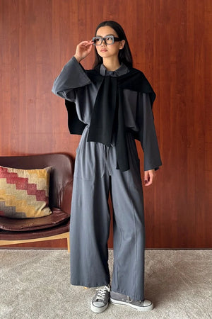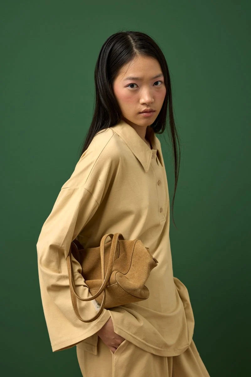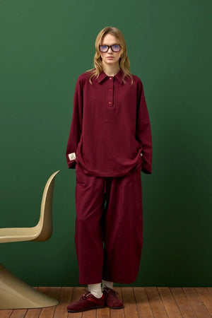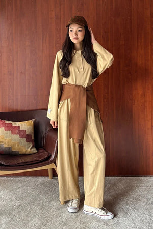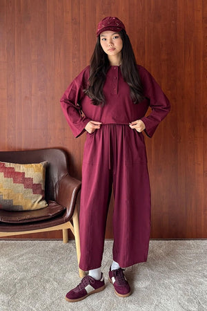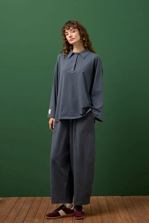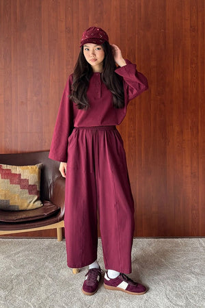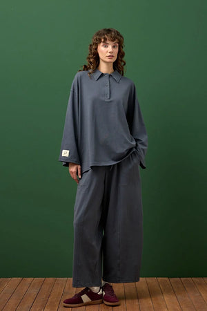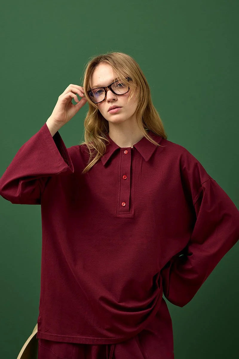 مصنوع من قماش سوبريم الناعم والمريح، ويتكوّن من تونيك بياقة بولو كلاسيكية وبنطال واسع بخصر مطاطي لارتداء سهل ومريح.