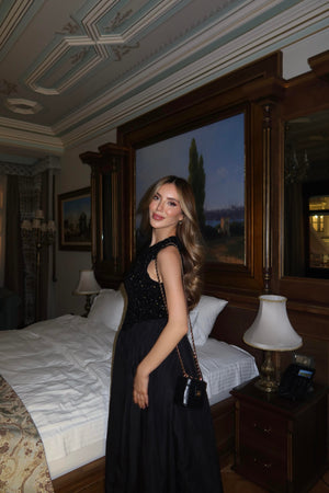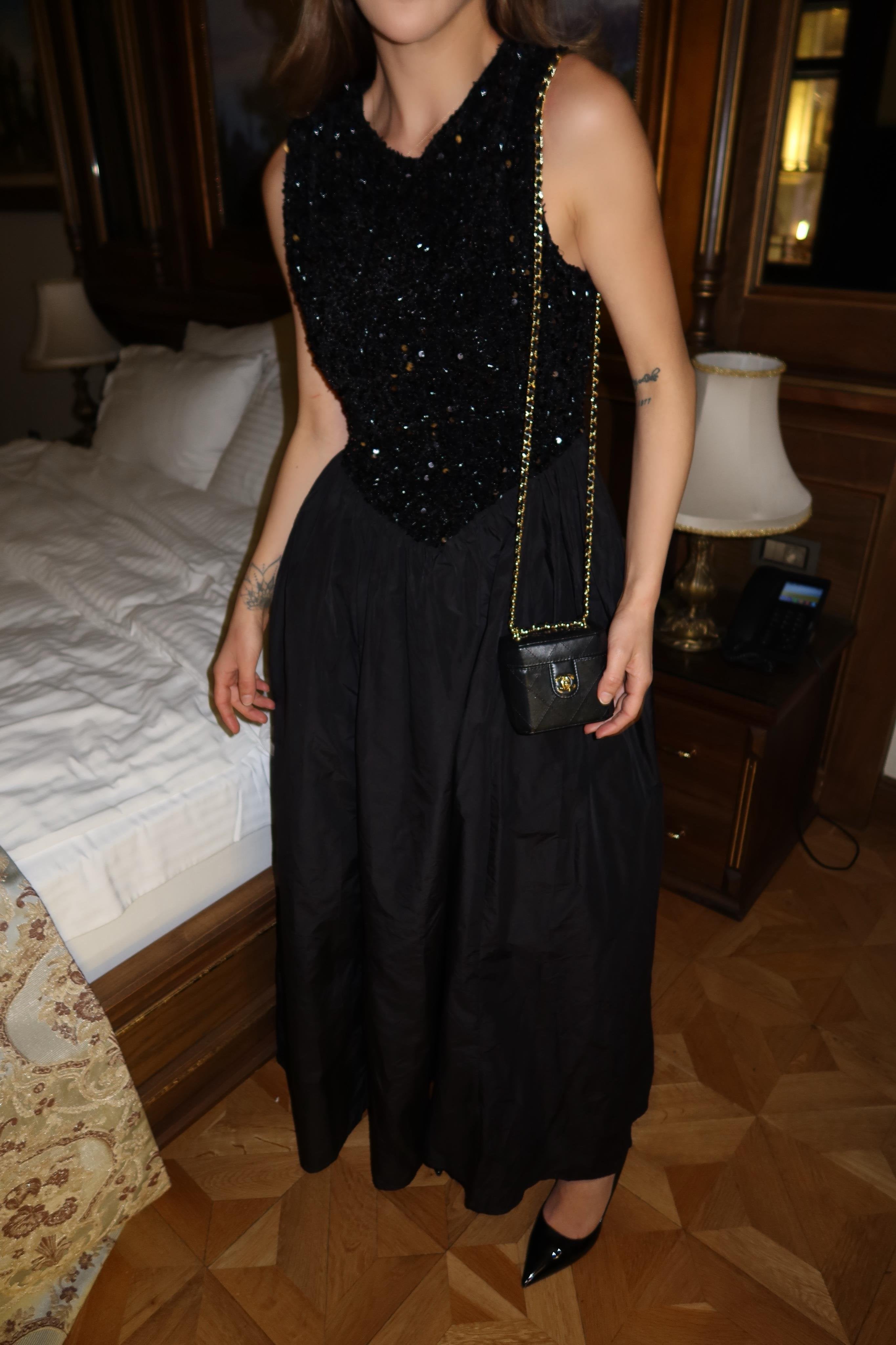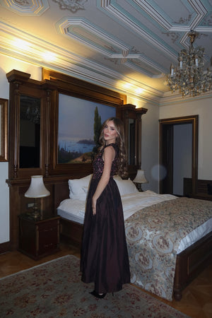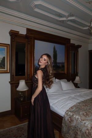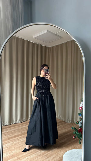 This Taffeta Skirt Sequin Detail Dress is designed to make a statement at special occasions and elegant evening events.