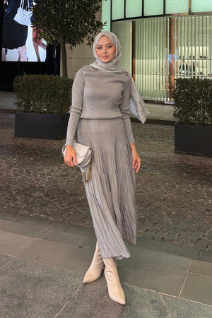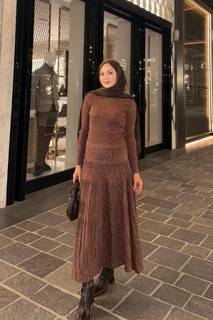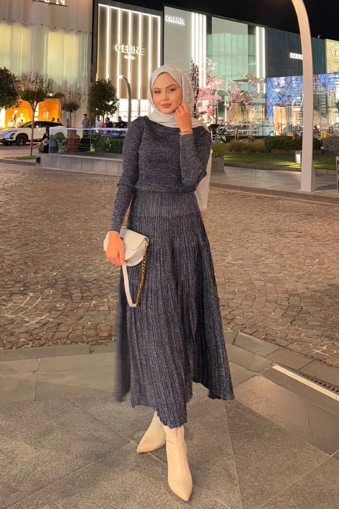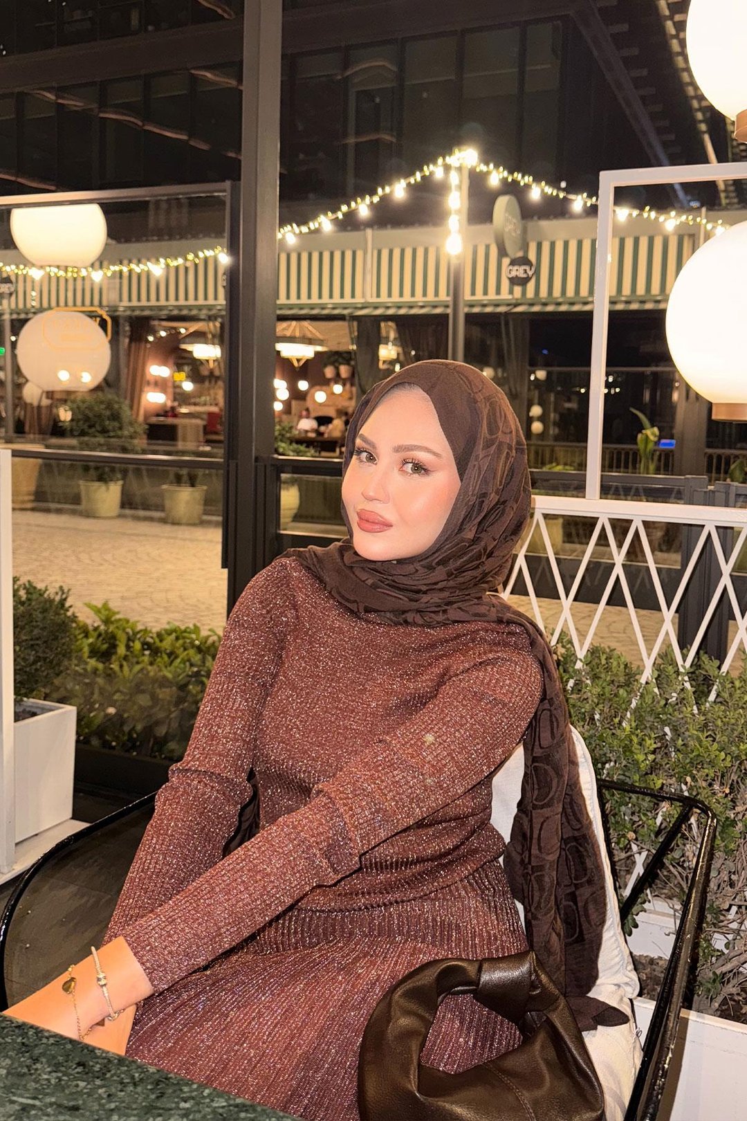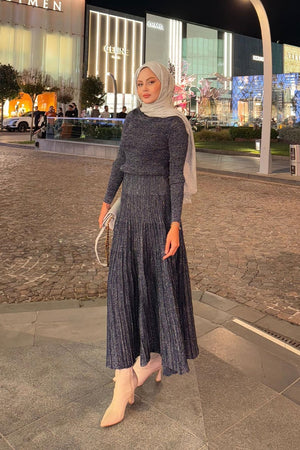 فستان أنيق وطويل يتميز بخيوط لامعة تضيف لمسة فخمة وعصرية.