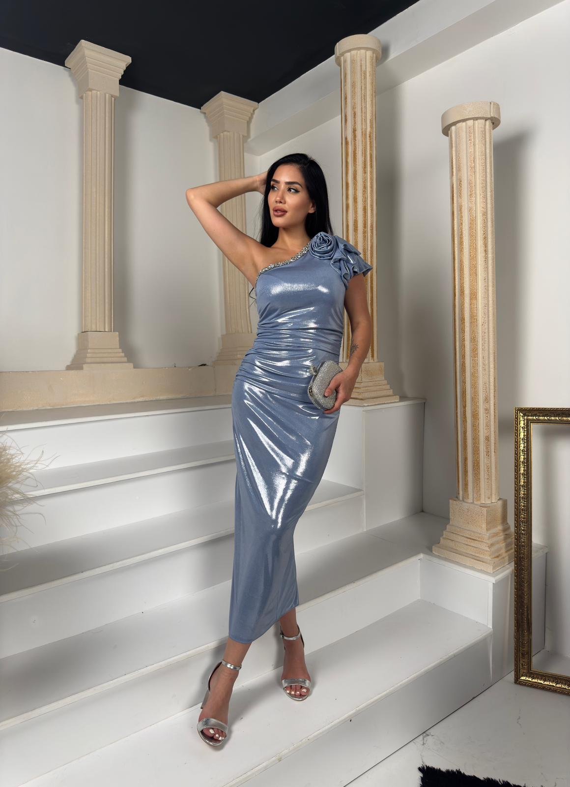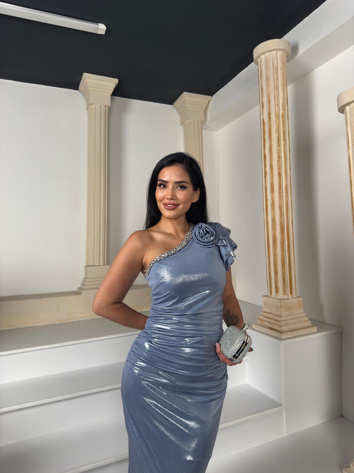 This shimmering evening dress with stone details is designed to create a luxurious and radiant look for special occasions. The glossy fabric reflects light beautifully, while the sparkling stone embellishments add an elegant and refined touch.