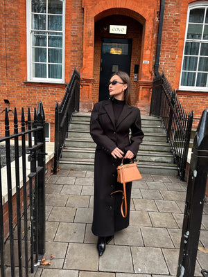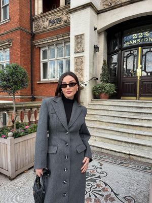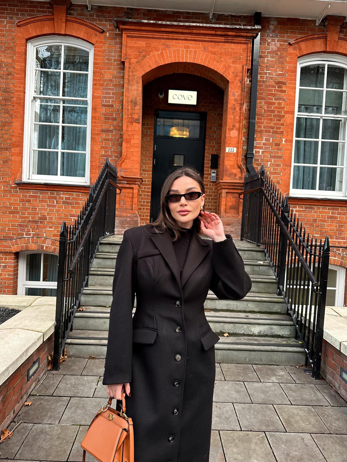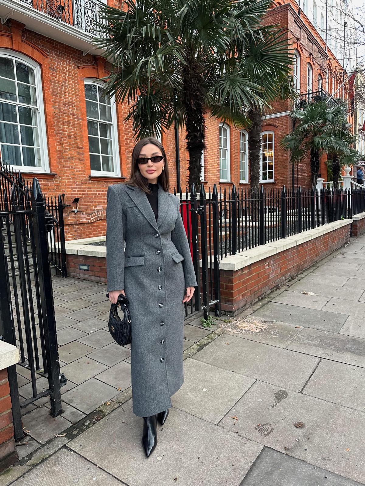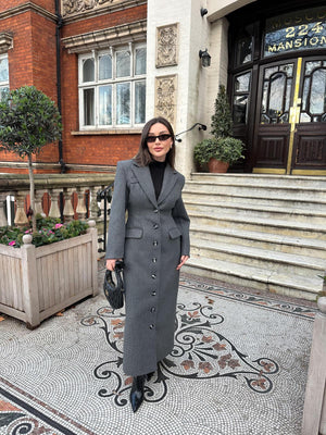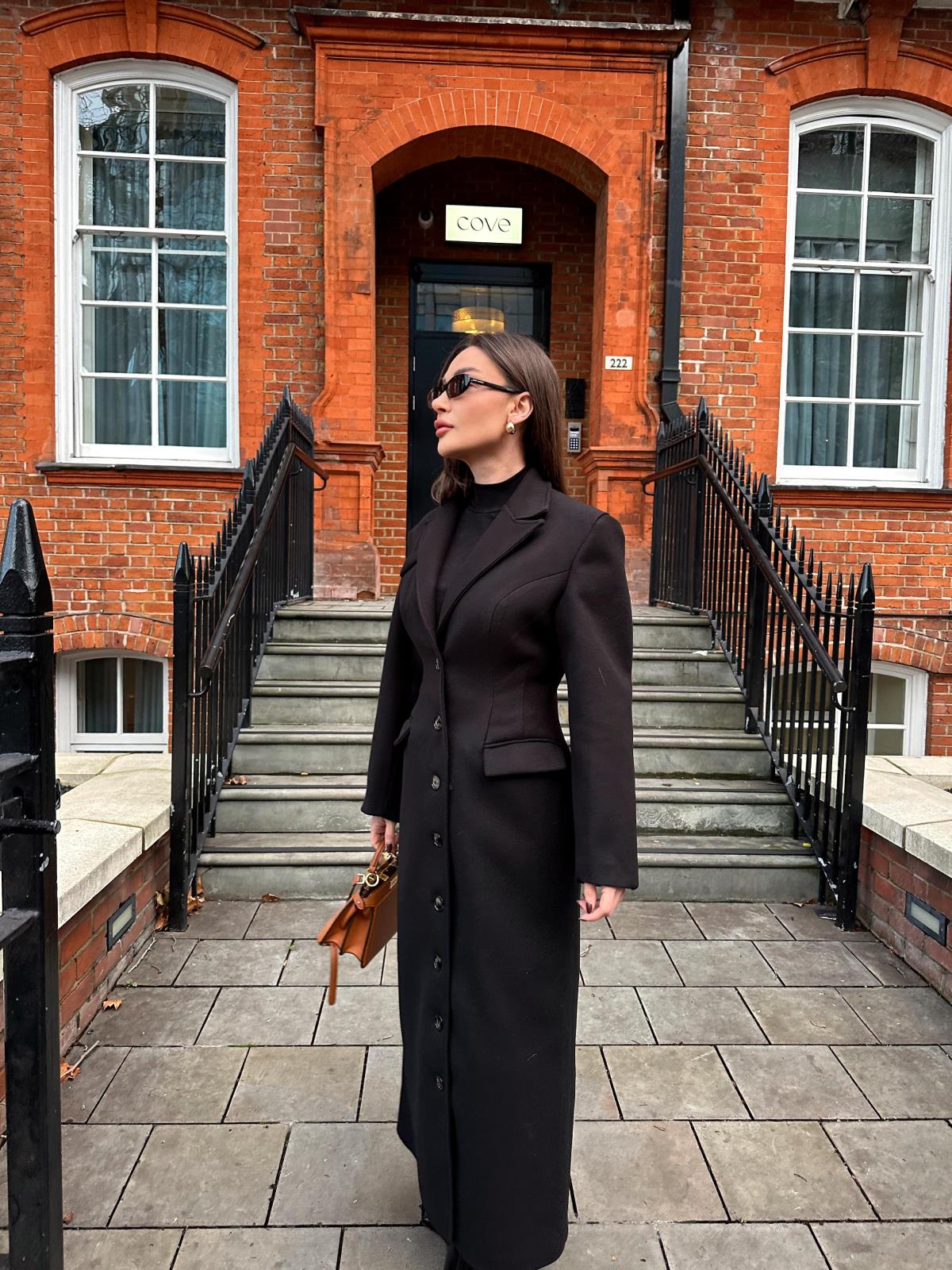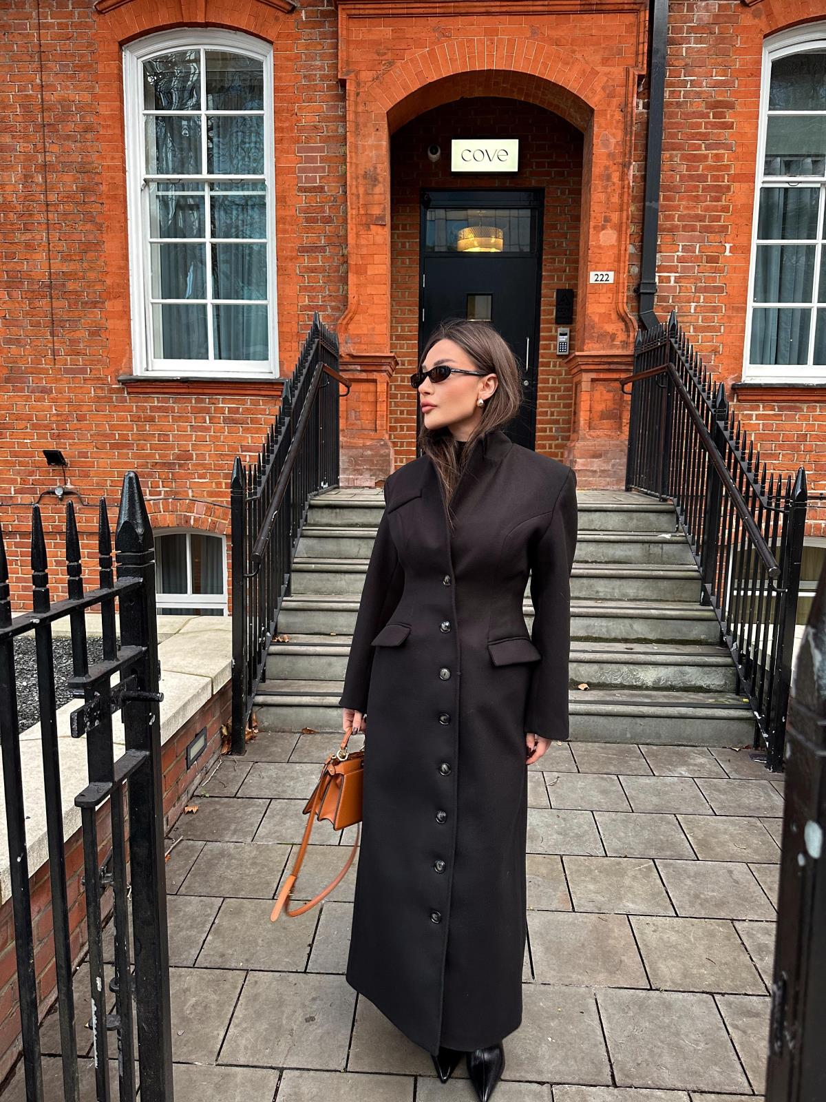 An elegant long coat designed in a slim-fit silhouette, featuring a V-neckline and multiple button closure with a lined interior for added comfort and warmth.