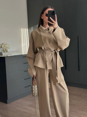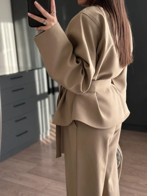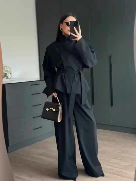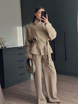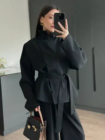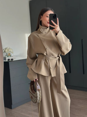 A modern women’s set featuring a stand collar jacket with a cross-button closure for a refined look, finished with a waist-tie belt to enhance the silhouette.