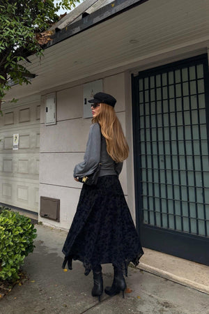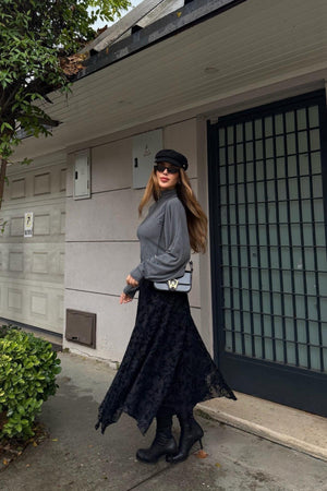 A stylish black skirt with an elegant pattern and an asymmetrical length that adds a modern touch. The elastic waist ensures comfort and ease, making it perfect for everyday and trendy looks.