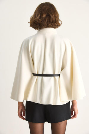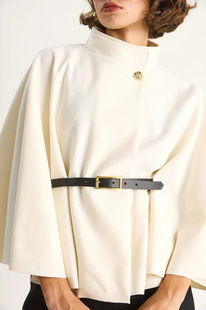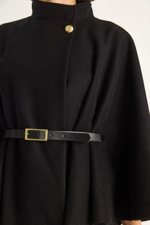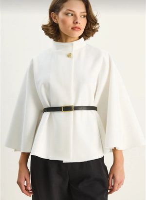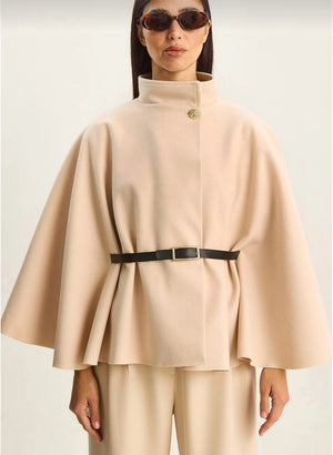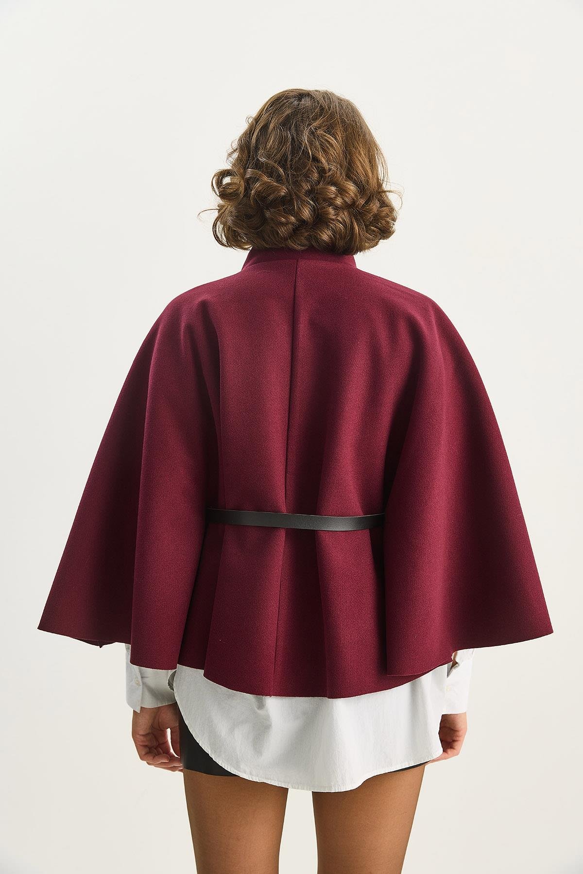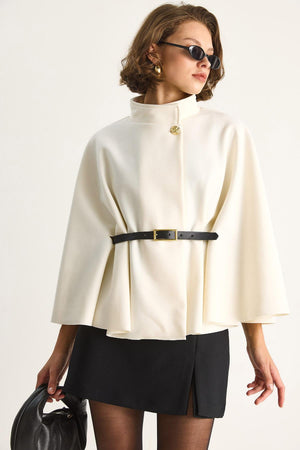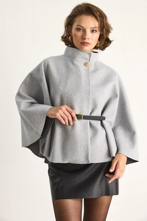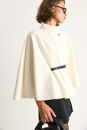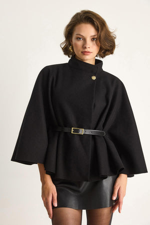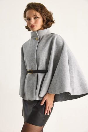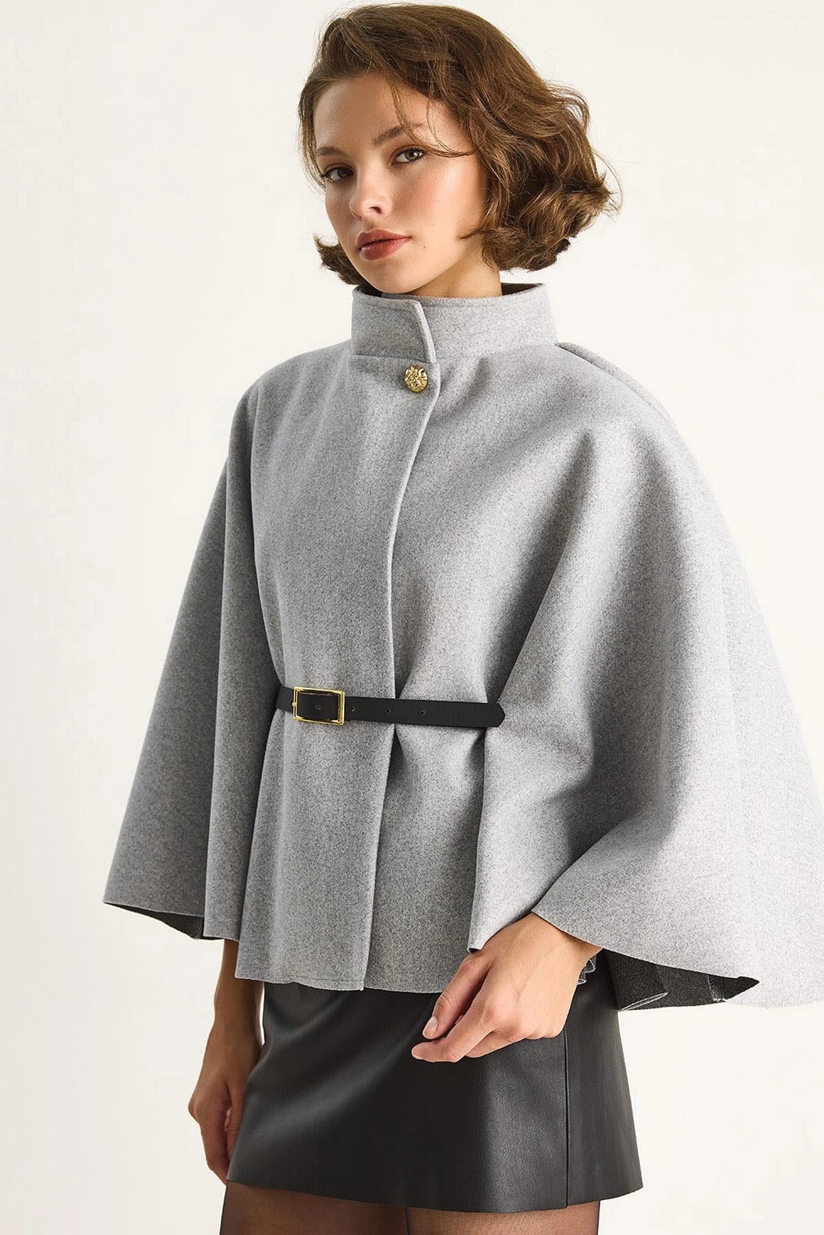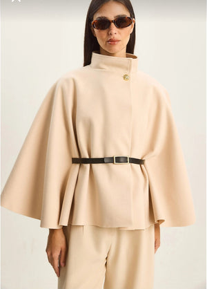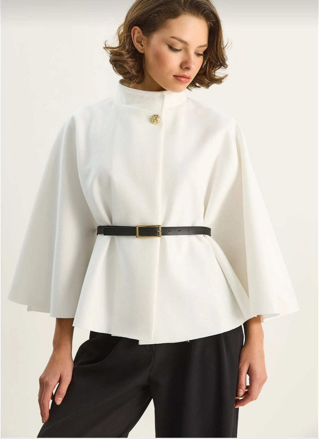 بونشو أنيق ومريح مصنوع من الصوف الفاخر مع حزام لتحديد الخصر وتفاصيل أزرار ذهبية تضيف لمسة أنثوية راقية. يتميز بتصميم فضفاض يتيح حركة سهلة، وأكمام قصيرة مع ياقة عالية، مما يجعله مثاليًا للإطلالات اليومية والخاصة.